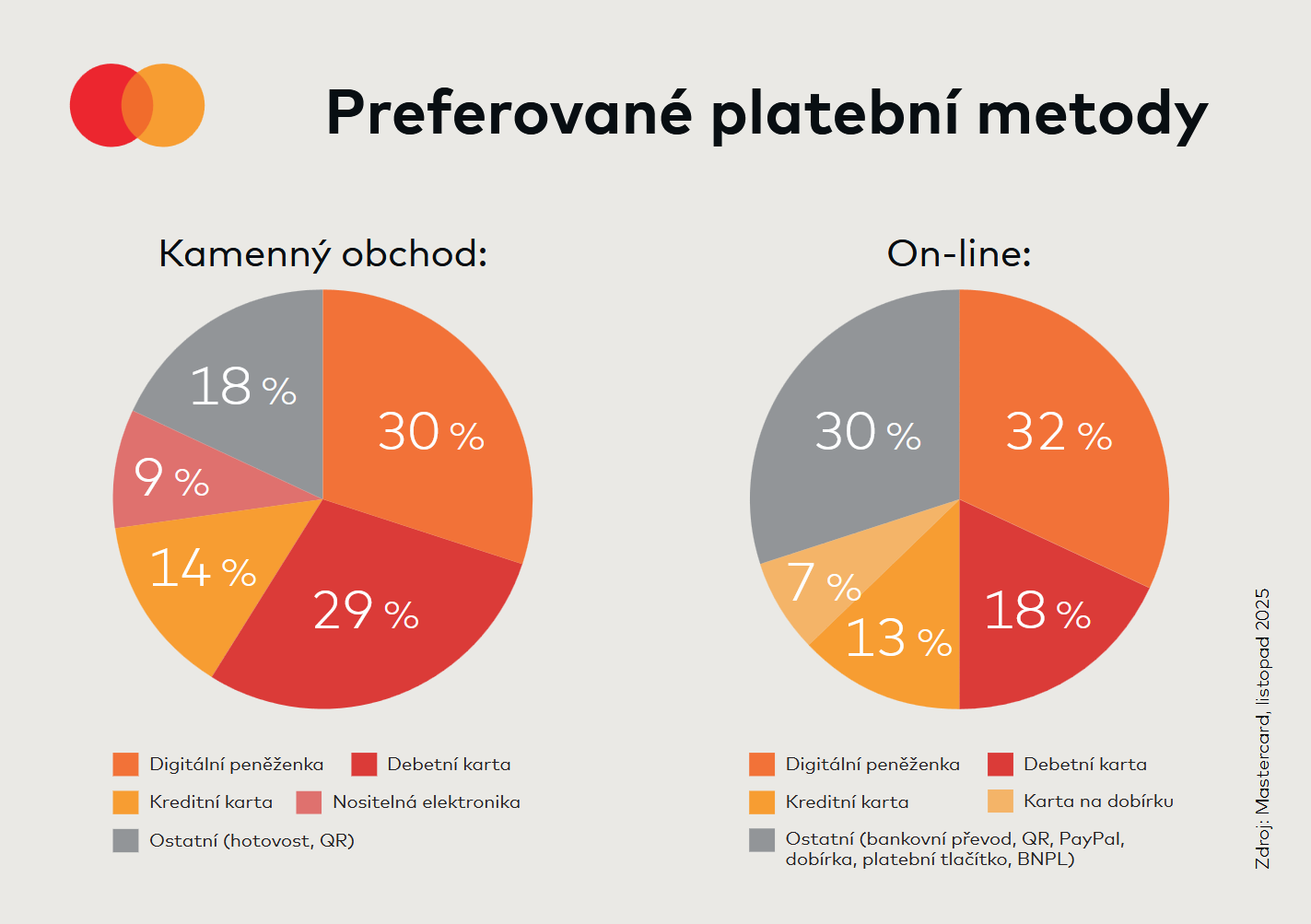 Digitální platby se v Česku staly běžným standardem každodenního nakupování. Devět z deseti zákazníků preferuje platbu kartou, mobilem nebo nositelnou elektronikou. V kamenných obchodech dává digitálním metodám přednost 85 procent lidí, v online prostředí dokonce 95 procent. Hotovost a další alternativní platební metody zůstávají spíše doplňkem než první volbou.Vyplývá to z aktuálního průzkumu společnosti Mastercard zaměřeného na platební chování spotřebitelů v Česku.