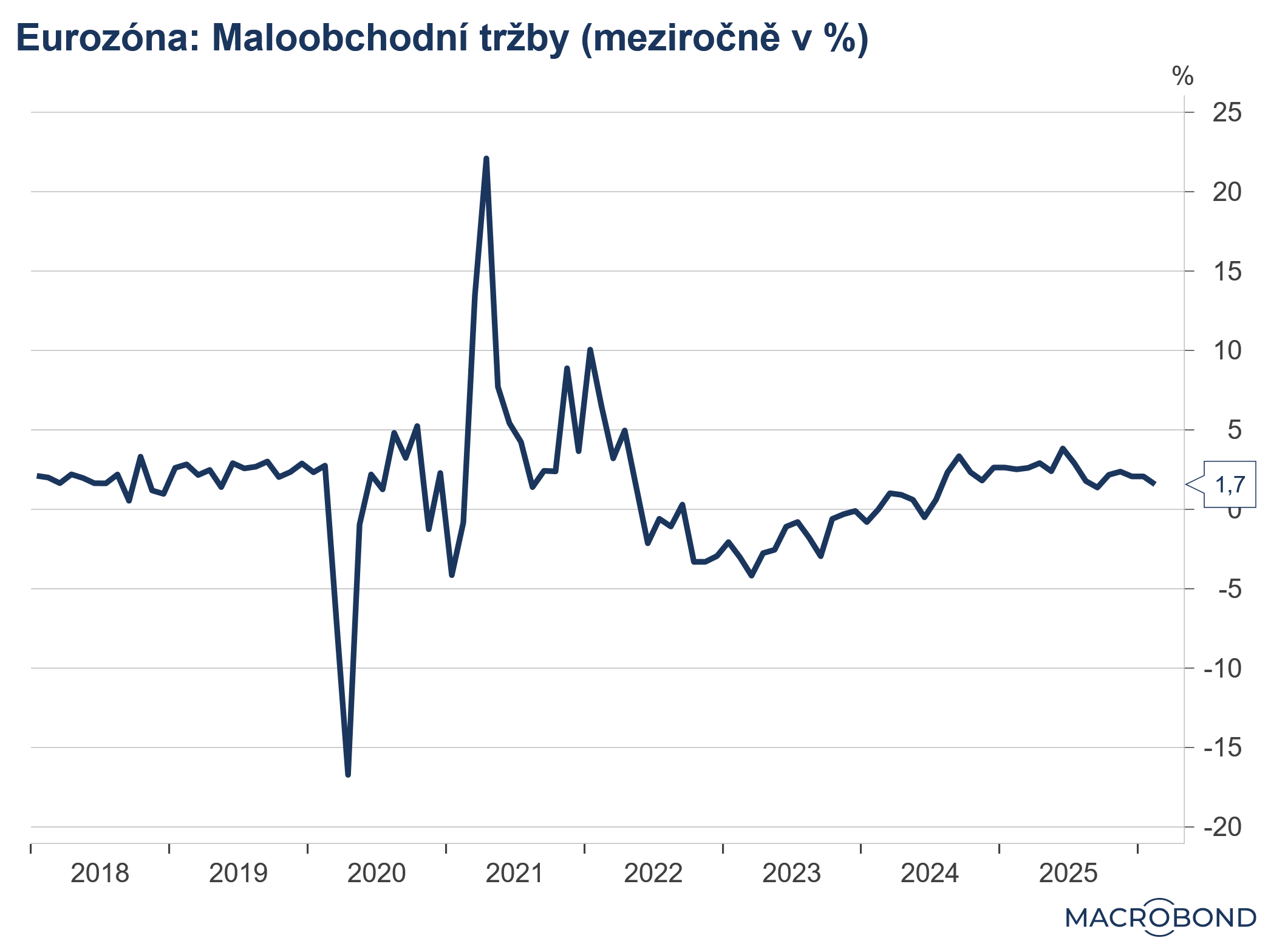 Maloobchodní tržby v listopadu klesly na 3,8 % meziročně oproti 5,7 % v říjnu. -
