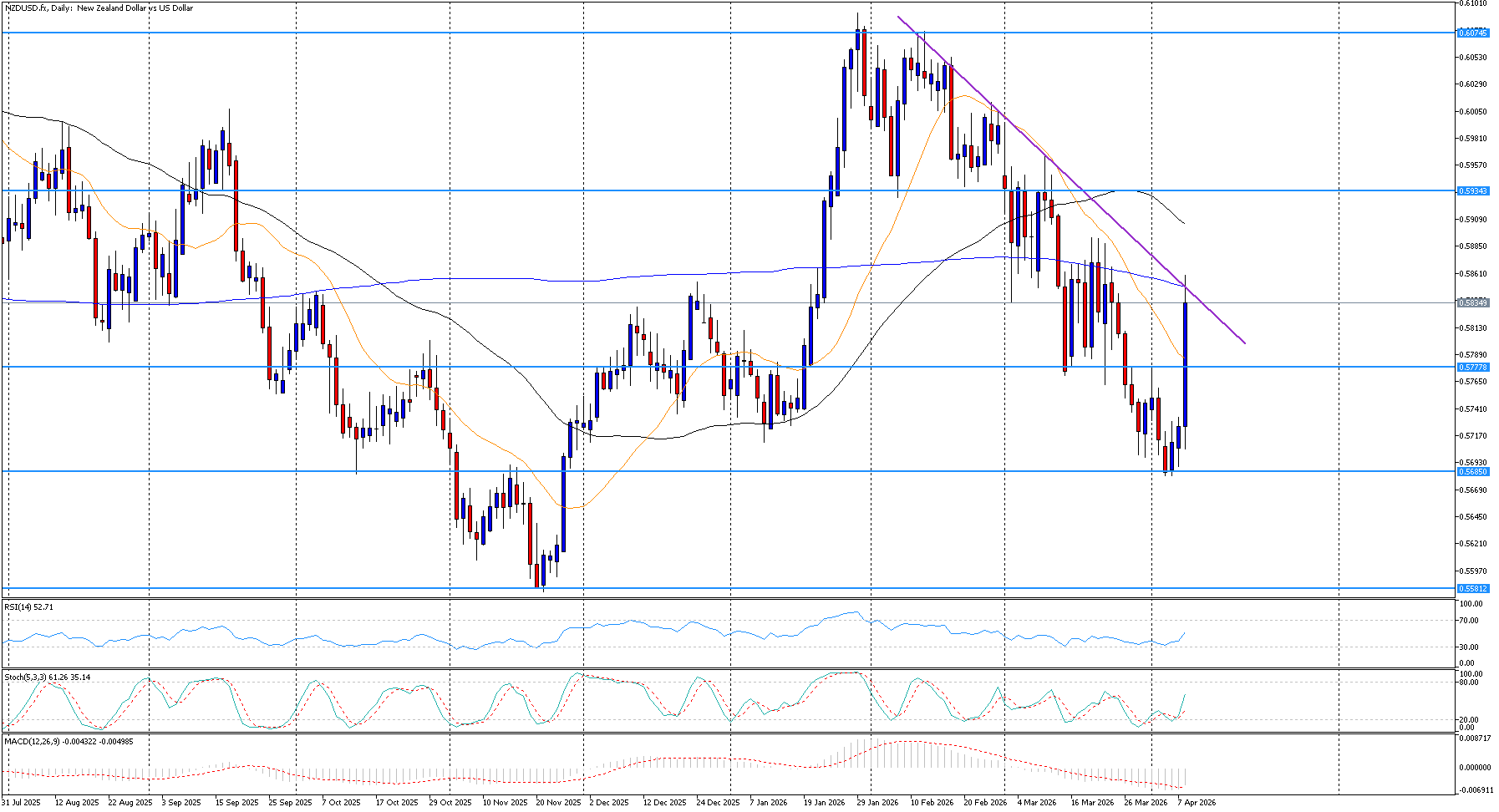 NZD/USD zaznamenává výrazné oživení, které je výsledkem kombinace dvou klíčových faktorů – jestřábího tónu Reserve Bank of New Zealand a současného uklidnění geopolitického napětí na Blízkém východě. Tento mix podporuje návrat chuti investorů k riziku a zároveň zvyšuje očekávání ohledně dalšího zpřísňování měnové politiky na Novém Zélandu. Novozélandská centrální banka sice ponechala úrokové sazby beze změny, ale svým komentářem jasně naznačila, že v případě druhotných inflačních tlaků je připravena jednat rychle a razantně. Trhy si tuto rétoriku vyložily jako signál, že zvýšení sazeb v průběhu roku zůstává velmi pravděpodobné. Současně se geopolitická situace částečně uklidnila díky dohodě mezi USA a Íránem o dočasném příměří, což snížilo tlak na ceny energií a podpořilo riziková aktiva, včetně novozélandského dolaru. Technický obraz se v krátkodobém horizontu zlepšuje. RSI se dostal nad úroveň 50, což signalizuje návrat nákupního momenta, zatímco MACD překřížil svou signální linii směrem vzhůru. Cena se zároveň posunula nad 20denní klouzavý průměr a krátce pronikla i nad 200denní SMA, což je významný technický milník. Právě v této oblasti se však odehrává klíčový boj mezi kupci a prodejci, protože zde zároveň probíhá i krátkodobá klesající trendová linie. Další vývoj bude záviset na tom, zda se trhu podaří tuto zónu přesvědčivě překonat. Nejbližší rezistence leží těsně pod úrovní 0,5850, jejíž proražení by potvrdilo pokračování oživení z dubnových minim. Následně by se pozornost přesunula k úrovni 0,5894 a dále k oblasti kolem 0,5970. V případě silnějšího růstu by se otevřel prostor až k 0,6091, což představuje významné maximum z předchozího období. Na opačné straně zůstává riziko, že 200denní klouzavý průměr znovu potvrdí svou roli silné bariéry. V takovém případě by se pár mohl vrátit k podpoře v oblasti 0,5775, kde se sbíhá 20denní SMA s důležitou horizontální úrovní. Její prolomení by oslabilo aktuální býčí scénář a mohlo by vést k opětovnému testování dubnového minima na 0,5678. Celkově NZD/USD těží z kombinace příznivého fundamentu a zlepšujícího se technického obrazu, avšak rozhodující potvrzení silnějšího růstového trendu bude vyžadovat jasné denní uzavření nad 200denním klouzavým průměrem. Do té doby zůstává současný pohyb spíše fází oživení v rámci širší nejistoty.