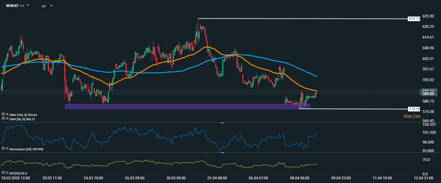 Cena pšenice se obchoduje kolem 584,88 USD a po odrazu od silné podpůrné zóny v pásmu kolem 576,69 USD se snaží stabilizovat. V posledních hodinách je patrná snaha kupců o návrat vzhůru, aktuálně však trh naráží na blízký klouzavý průměr EMA 50 na úrovni 586,27 USD, který zatím funguje jako krátkodobá rezistence. Nad cenou navíc zůstává i SMA 100 na hodnotě 593,64 USD, což potvrzuje, že širší krátkodobý trend je stále spíše opatrný až neutrálně medvědí. RSI se nachází na hodnotě 49,9, tedy poblíž neutrální zóny, což ukazuje na vyrovnaný poměr mezi kupci a prodejci bez jasného překoupení či přeprodanosti. Momentum se drží lehce nad hladinou 100, což naznačuje mírné zlepšení krátkodobé dynamiky a podporuje scénář dalšího technického odrazu. Pro potvrzení silnějšího růstu by ale pšenice potřebovala dostat se nad oblast 586–594 USD, kde se nachází důležité technické bariéry.