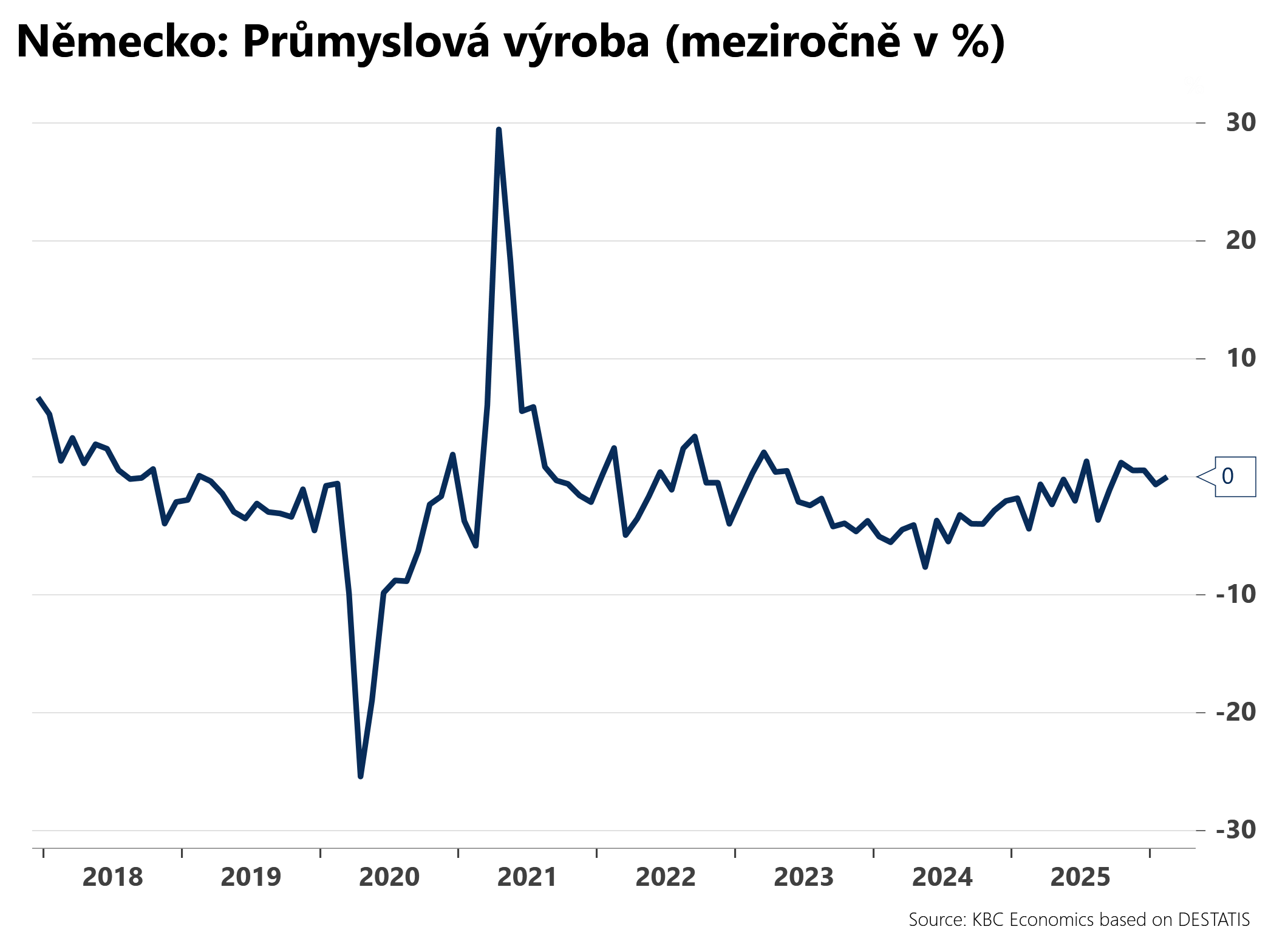 Průmyslová výroba v říjnu klesla meziročně na nulu oproti revidovaným 3,1 % v září. Trhy očekávaly pokles -0,7 % meziročně. -