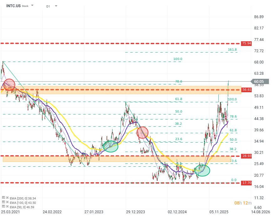 Během dnešní obchodní seance akcie společnosti Intel rostou o více než 7 % po zprávách, že by firma mohla vyrábět některé z čipů řady M pro Apple. Trh vnímá tuto možnou spolupráci jako příležitost pro posílení postavení Intelu v polovodičovém průmyslu a obnovu jeho výrobních kapacit, což je významný faktor v aktuálním geopolitickém kontextu.