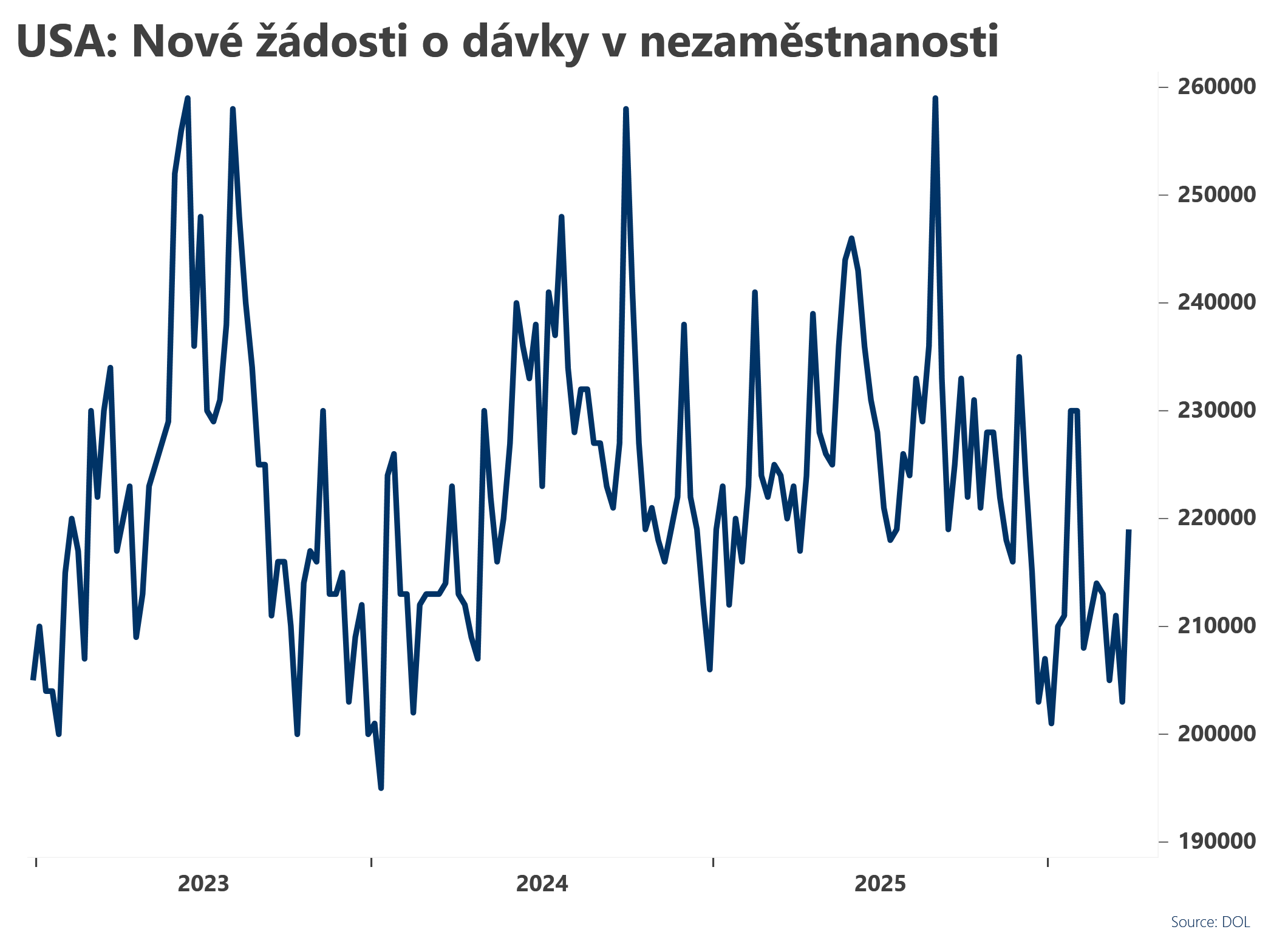 Počet nových žádostí o dávky v nezaměstnanosti v minulém týdnu vzrostly na 219 tis. oproti revidovaným 203 tis. v předminulém týdnu. Trhy očekávaly růst o 210 tis. nových žádostí.