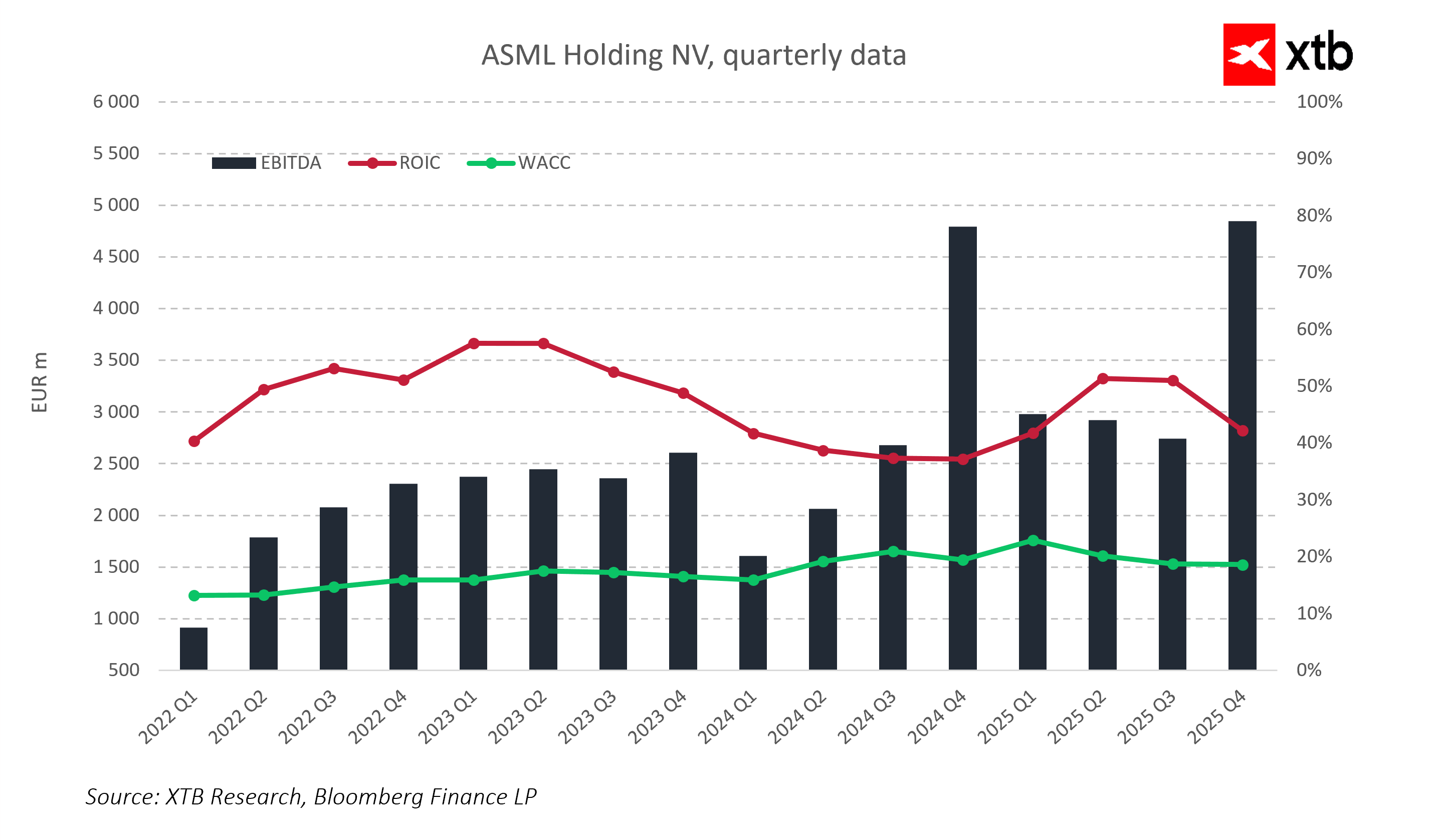 Z finančního pohledu je ASML příkladná firma. Má téměř nulový čistý dluh, vysokou likviditu a efektivně využívá svůj kapitál. Návratnost investovaného kapitálu je několikanásobně vyšší než jeho cena, což znamená, že společnost nejen roste, ale také dlouhodobě vytváří skutečnou hodnotu pro akcionáře. Zároveň efektivně řídí cyklická tržní rizika a udržuje stabilitu i během ekonomických výkyvů.