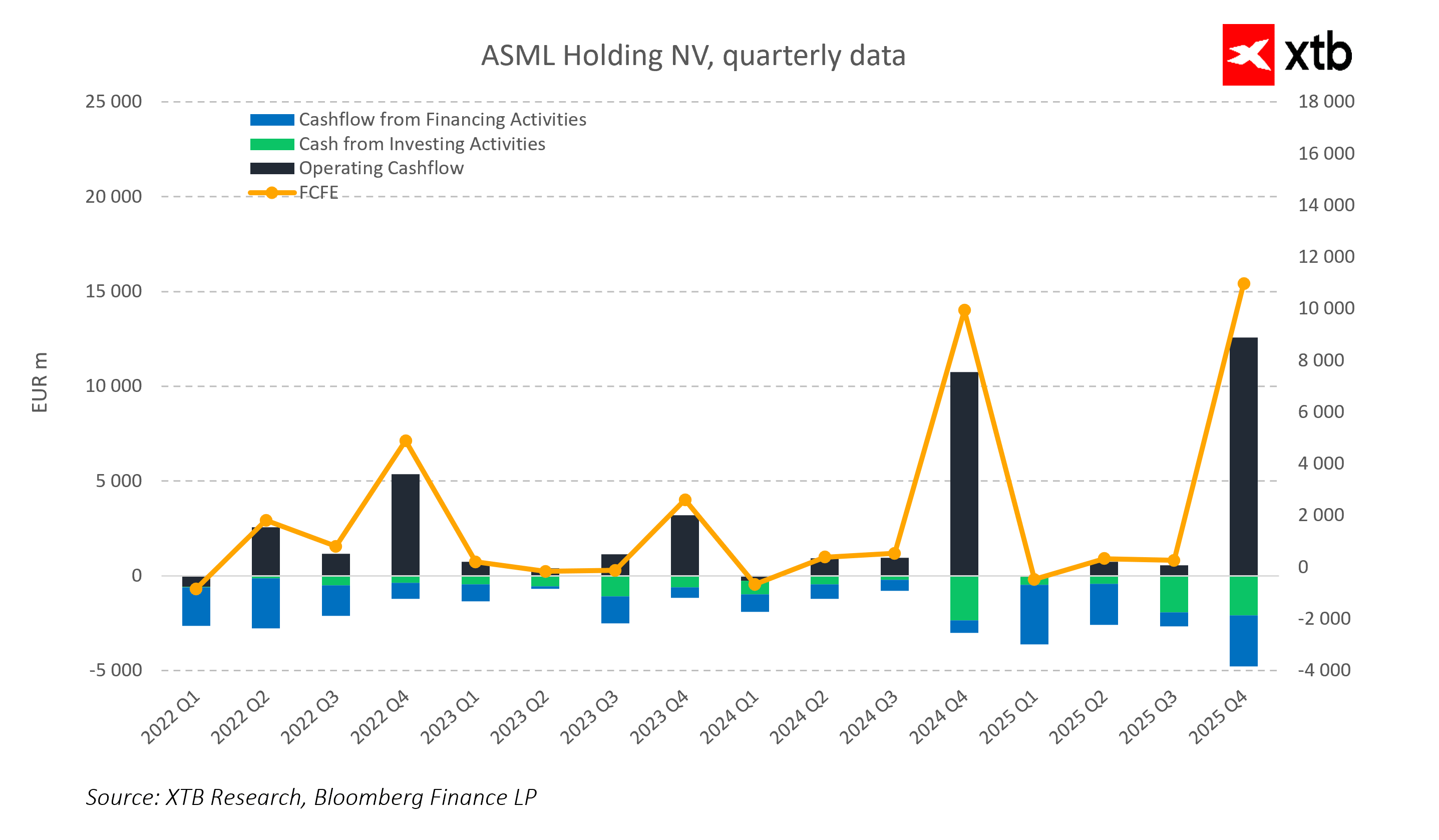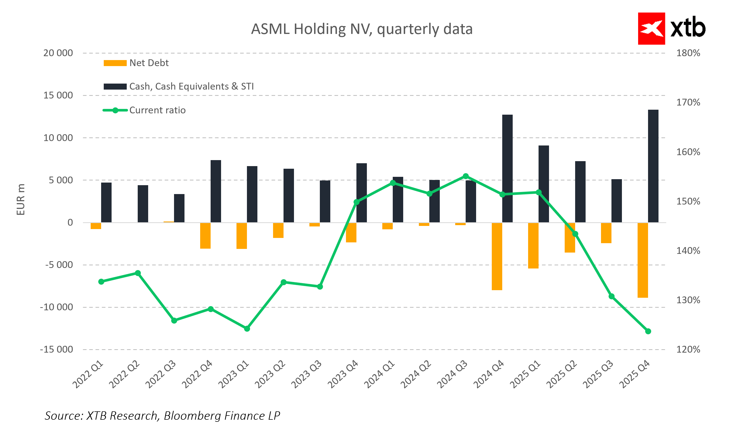 Současně její tržní ocenění zůstává proměnlivé a citlivé na očekávání budoucího růstu. Pravidelné poklesy valuací naznačují, že trh občas koriguje přehnaný optimismus, ASML je však nadále vnímána jako lídr s nadprůměrným potenciálem a silnými fundamenty. Společnost kombinuje růst s vysokou tvorbou hotovosti a silnou finanční pozicí, což jí umožňuje pokračovat v investicích do inovací a globální expanze.