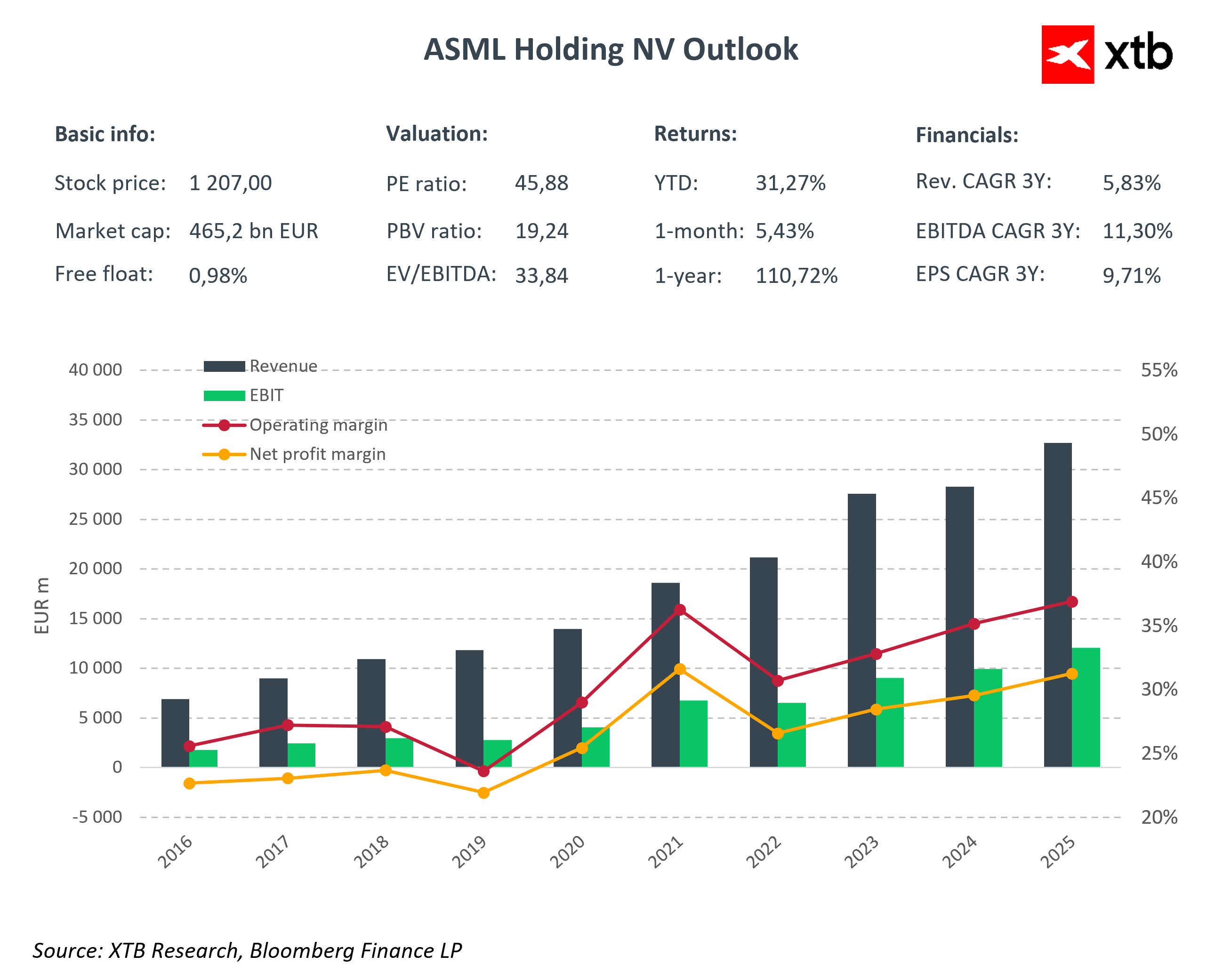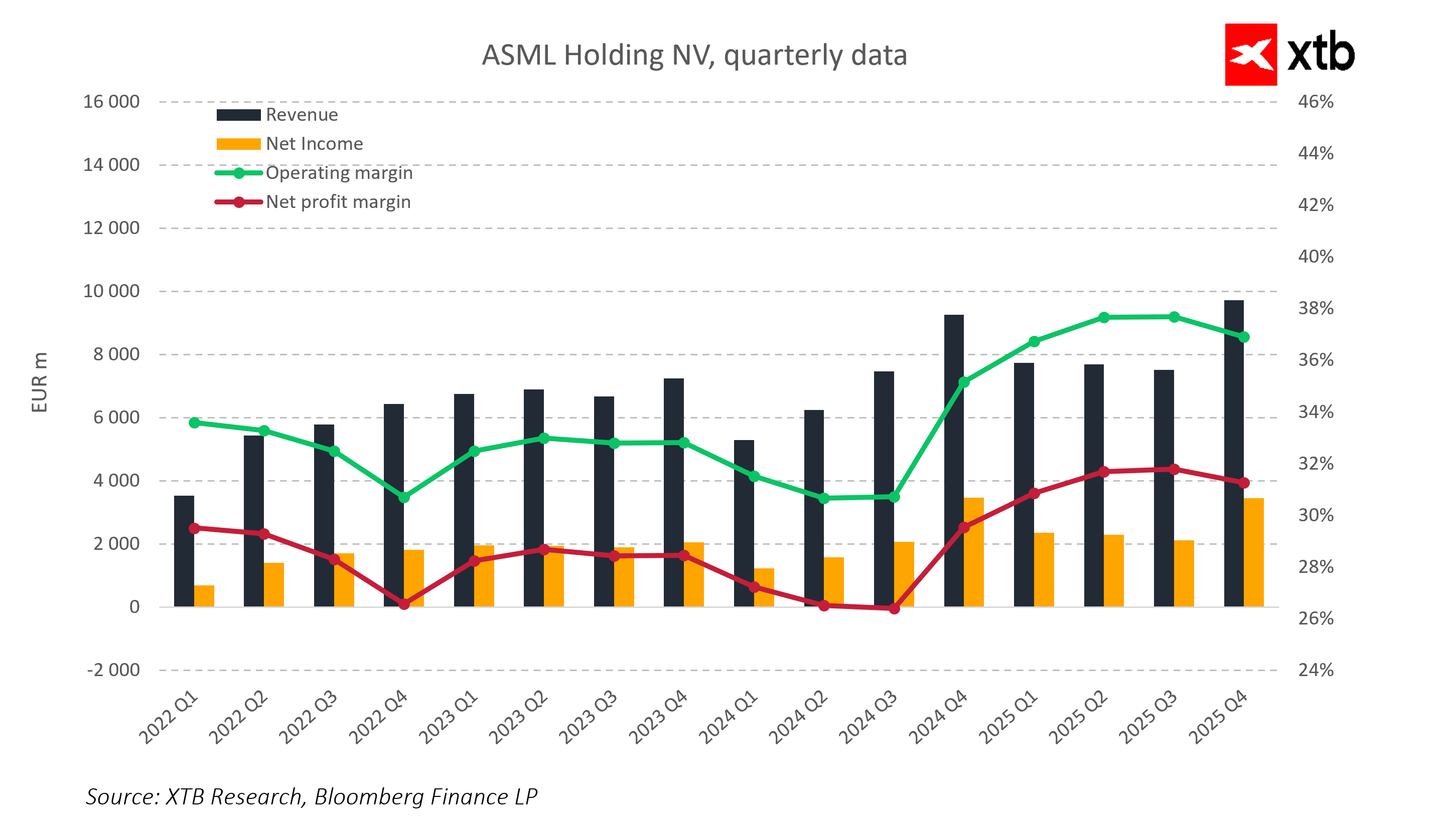 ASML je společnost, která systematicky zvyšuje tržby a zároveň zlepšuje provozní efektivitu. Růst tržeb jde ruku v ruce s rostoucí ziskovostí, což odráží vynikající kontrolu nákladů a vysokou hodnotu produktů. Provozní i čisté marže zůstávají na velmi atraktivních úrovních, což znamená, že každé vydělané euro přináší solidní zisk. Tato schopnost generovat vysoké marže dává společnosti konkurenční výhodu a potvrzuje její vedoucí postavení v oblasti pokročilých polovodičových technologií.
