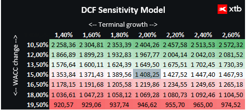 Ocenění vychází ze základního scénáře odhadů tržeb a finanční výkonnosti. Předpokládané náklady kapitálu, tedy WACC, poskytují realistický pohled na situaci, zatímco konzervativní předpoklady ohledně terminální hodnoty odrážejí opatrný přístup k budoucím vyhlídkám.
