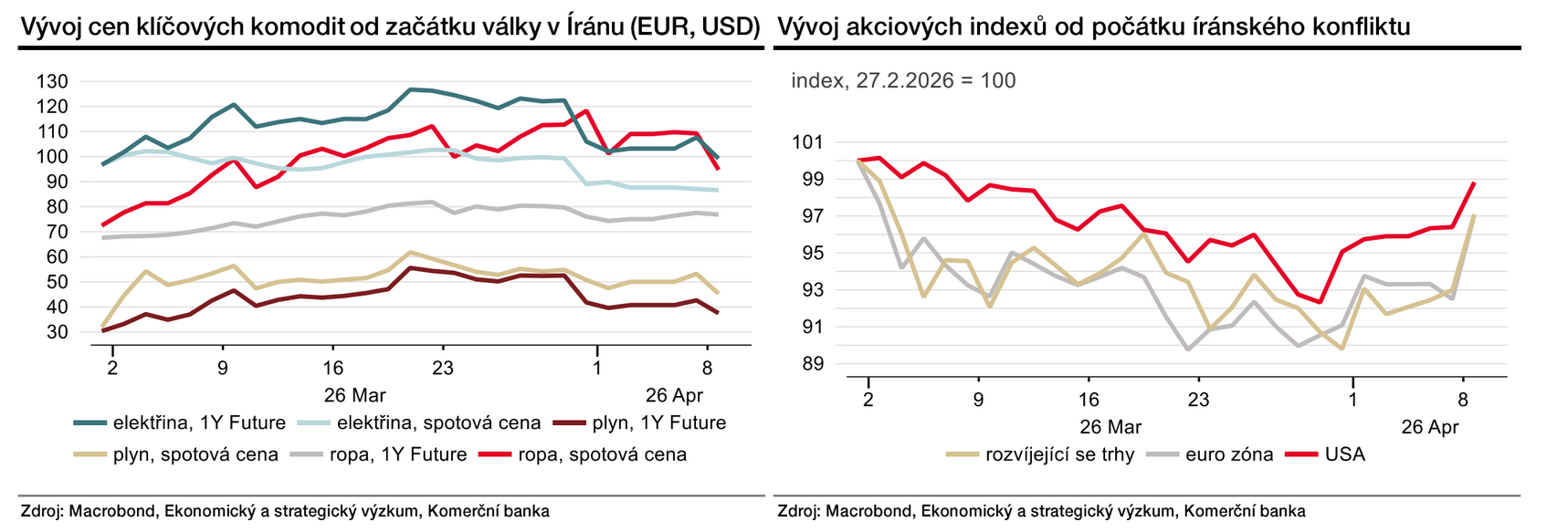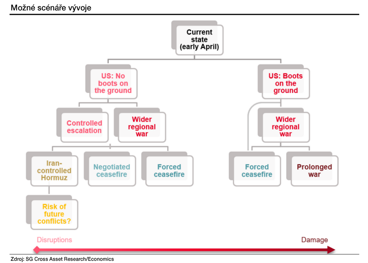 Pro ekonomiku platí jednoduché pravidlo: dokud se ropa drží pod 100 dolary za barel, trhy mají tendenci jít dál. Reálné dopady ale nezmizí. Normalizace toků ropy a LNG přes Hormuz bude totiž pomalá, zrovna tak obnova již poničené těžební a přepravní infrastruktury. I když se dnes radujeme z nižších cen energetických komodit, zůstávají výrazně výše než před konfliktem. Výsledkem bude podle nás spíše déletrvající inflační tlak než hlubší recese. Centrální banky, včetně té české, tak zůstanou obezřetné.