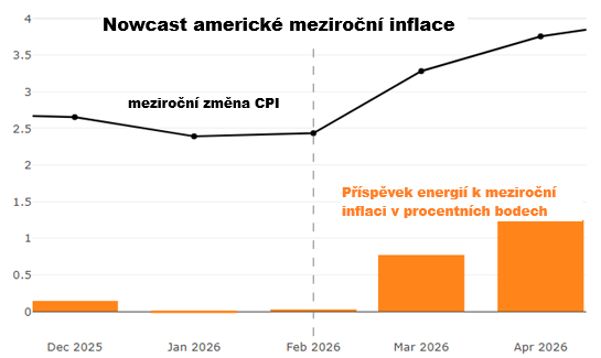 Americká spotřebitelská inflace za měsíc březen by měla být prvním oficiálním cenovým indexem, který by měl zachytit zdražení pohonných hmot v největší ekonomice světa. Průměrná cena benzínu v USA vzrostla v březnu o 24 %,a to se muselo zásadně projevit na zrychlení celkové inflace. Náš nowcast – Americký stopař – přitom indikuje, že by celková meziroční inflace mohla zrychlit z únorových 2,4 % na 3,28 % v březnu, což implikuje meziměsíční nárůst o 0,86 % (jde o sezónně očištěný údaj). Co se pak týká jádrové inflace, tak ta by se měla oproti únorové hodnotě jen nepatrně zvýšit.