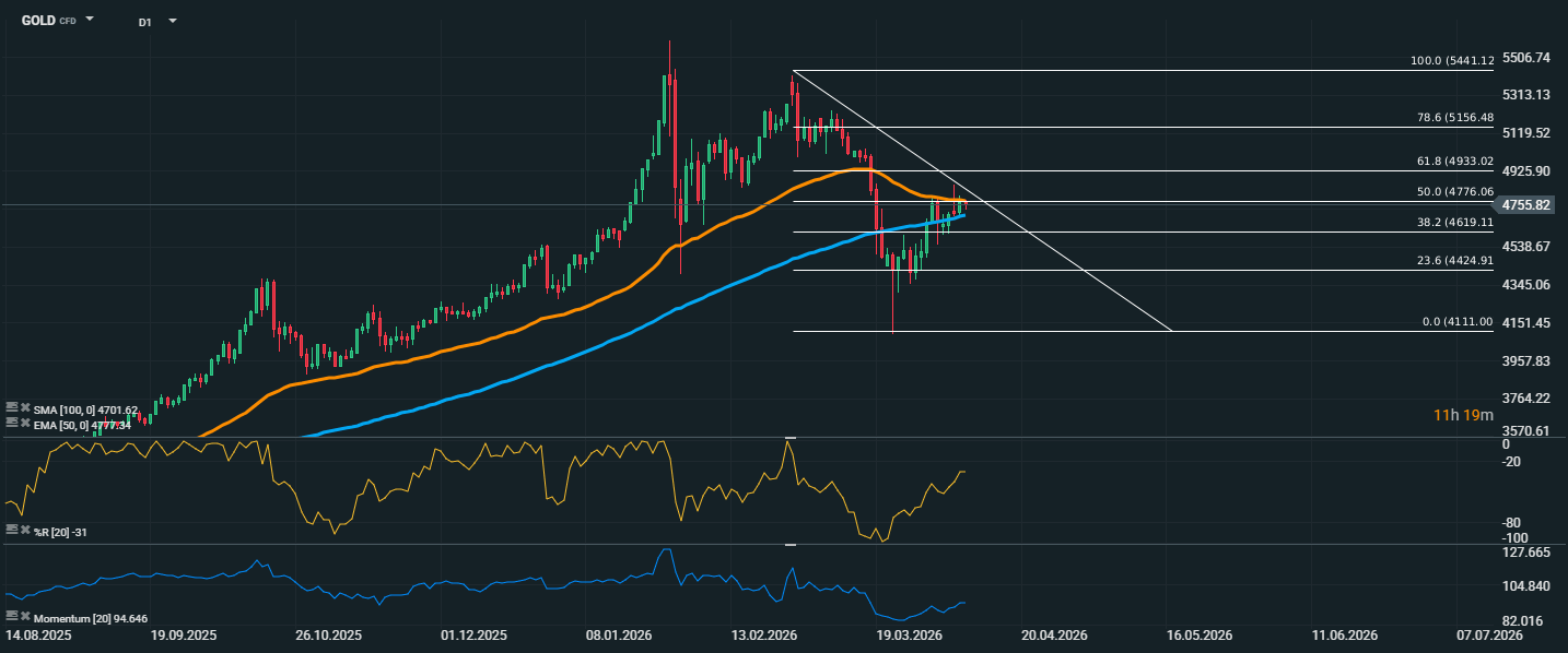 Cena zlata se aktuálně pohybuje kolem 4755,82 USD, což je těsně pod klíčovou Fibonacciho úrovní 50 % na 4776,06 USD. Cena se zároveň drží nad hladinou 38,2 % na 4619,11 USD, která nyní funguje jako důležitá technická podpora. Z technického pohledu je pozitivní, že trh po předchozím výprodeji zůstává nad SMA 100 na 4701,62 USD, což naznačuje, že delší růstová struktura ještě nebyla plně narušena. Naopak EMA 50 na 4777,34 USD zatím představuje krátkodobou rezistenci a cena se pod ní stále pohybuje. Williams %R se nachází kolem -31, což ukazuje na zlepšení nálady po předchozí slabosti. Momentum na hodnotě 94,65 stále ukazuje, že trh ještě plně neobnovil růstovou sílu. Pokud by se zlatu podařilo dostat stabilně nad oblast 4776–4780 USD, otevřel by se prostor pro růst směrem k 4933 USD. V opačném případě zůstává ve hře návrat k 4619 USD.