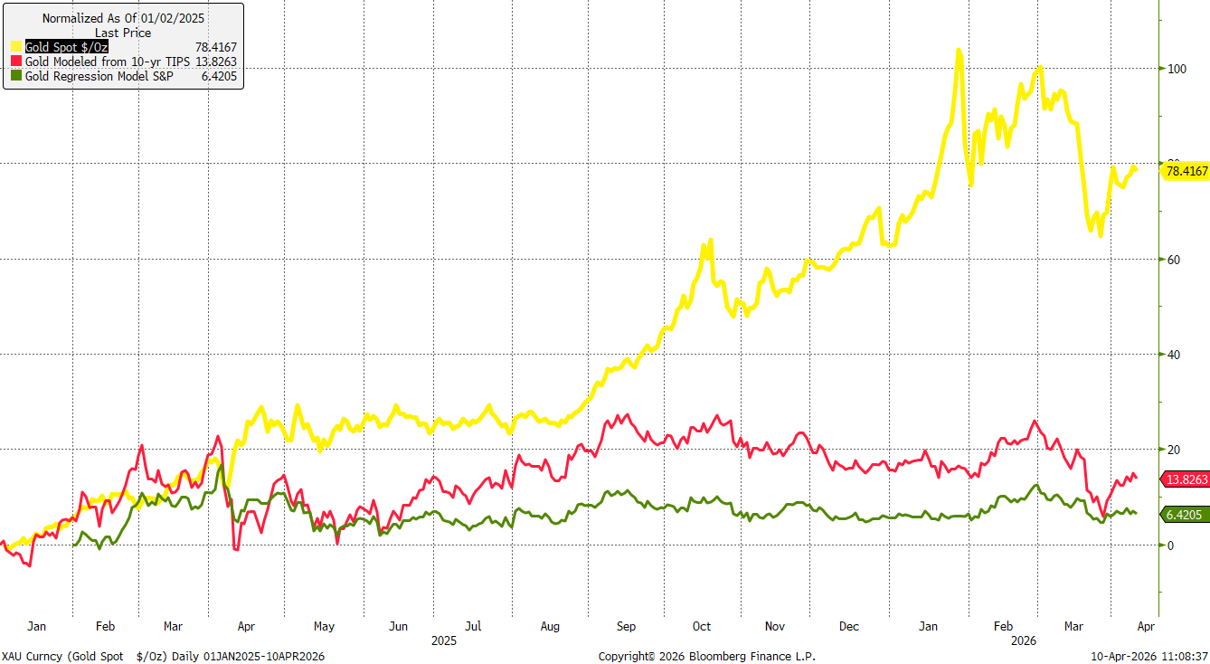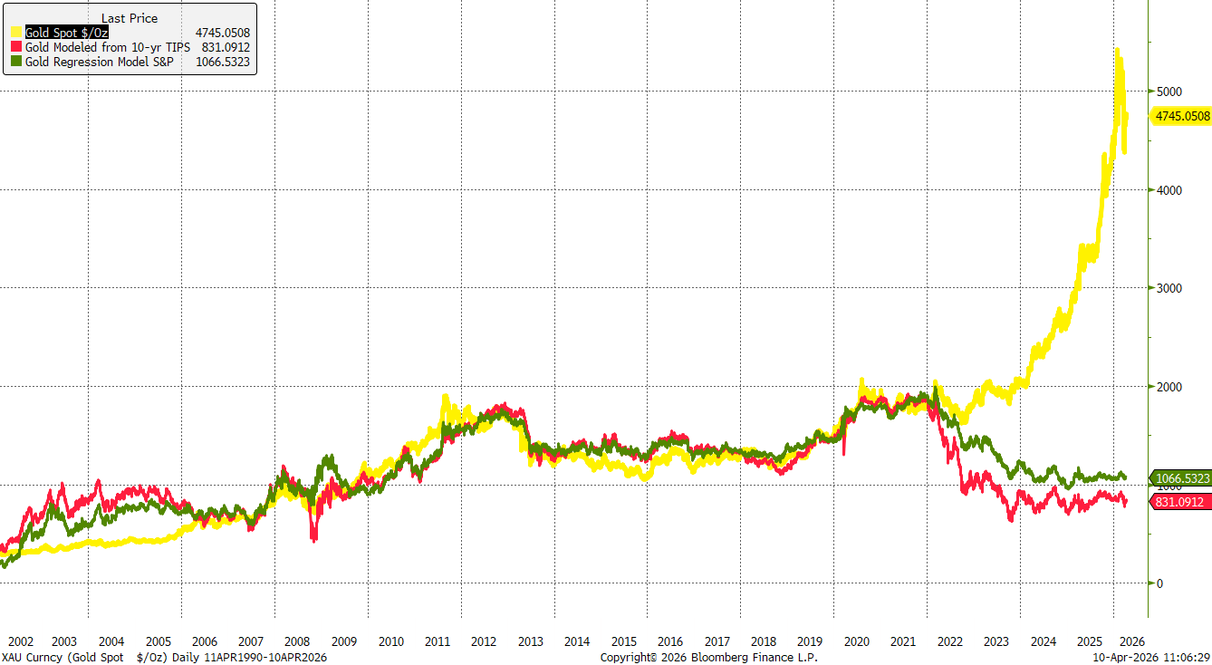 Zlato se od roku 2022 oddělilo od standardních tržních fundamentů. Zdroj: Bloomberg Finance LP