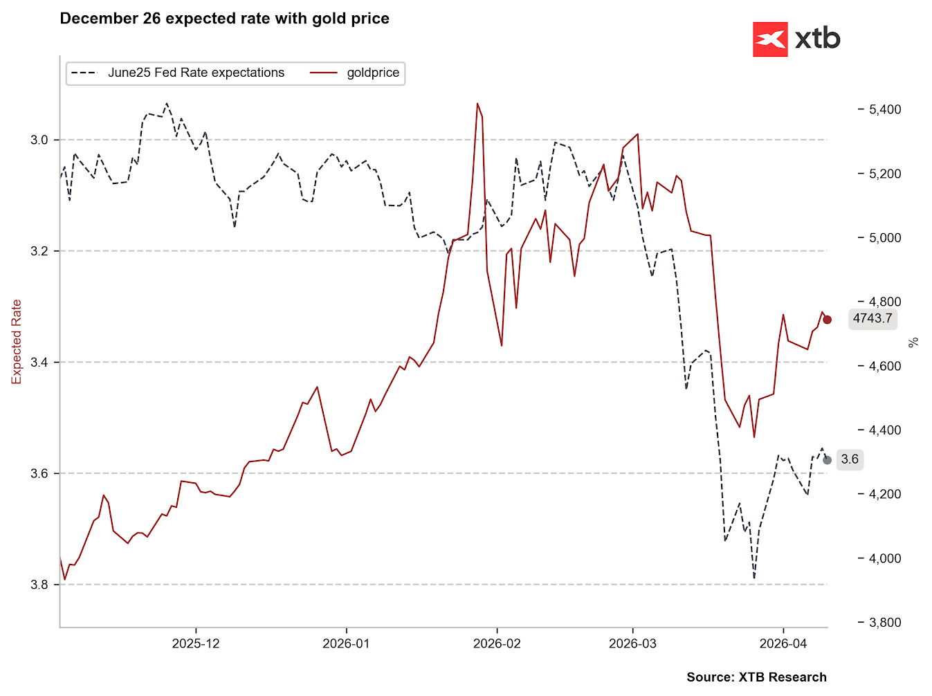 Ještě v únoru trh počítal s jedním až dvěma sníženími sazeb, přičemž efektivní sazba se pohybovala v pásmu 3,0–3,2 %. Do konce března se však očekávání posunula směrem k efektivní sazbě 3,8 % pro červen, což naznačovalo možnost zvýšení sazeb. Aktuálně se nacházíme na úrovni 3,6 %, což ukazuje na stabilizaci. Přesto se od začátku března objevila silná korelace mezi očekáváním ohledně úrokových sazeb a cenou zlata — vazba, která předtím prakticky neexistovala.