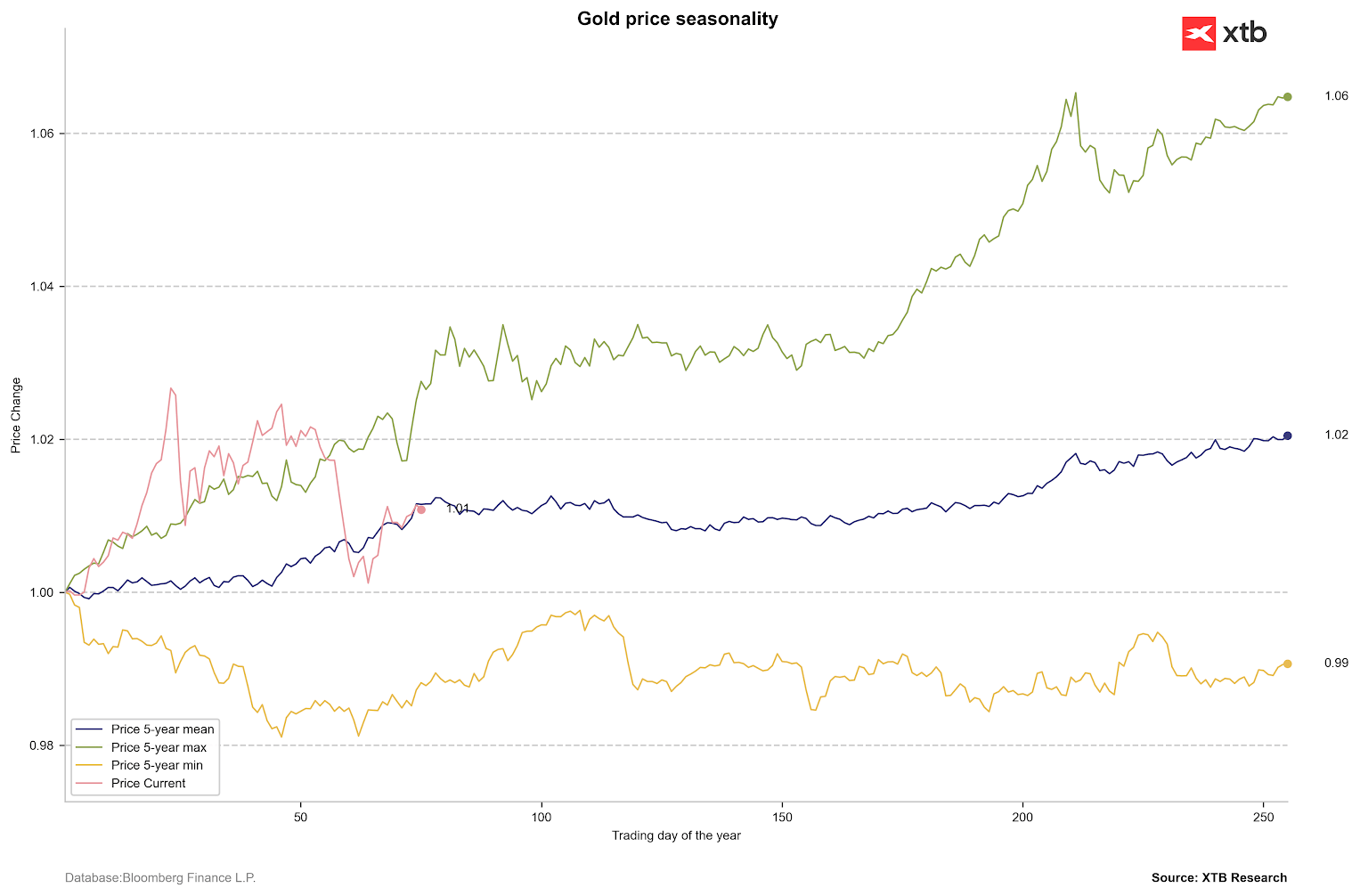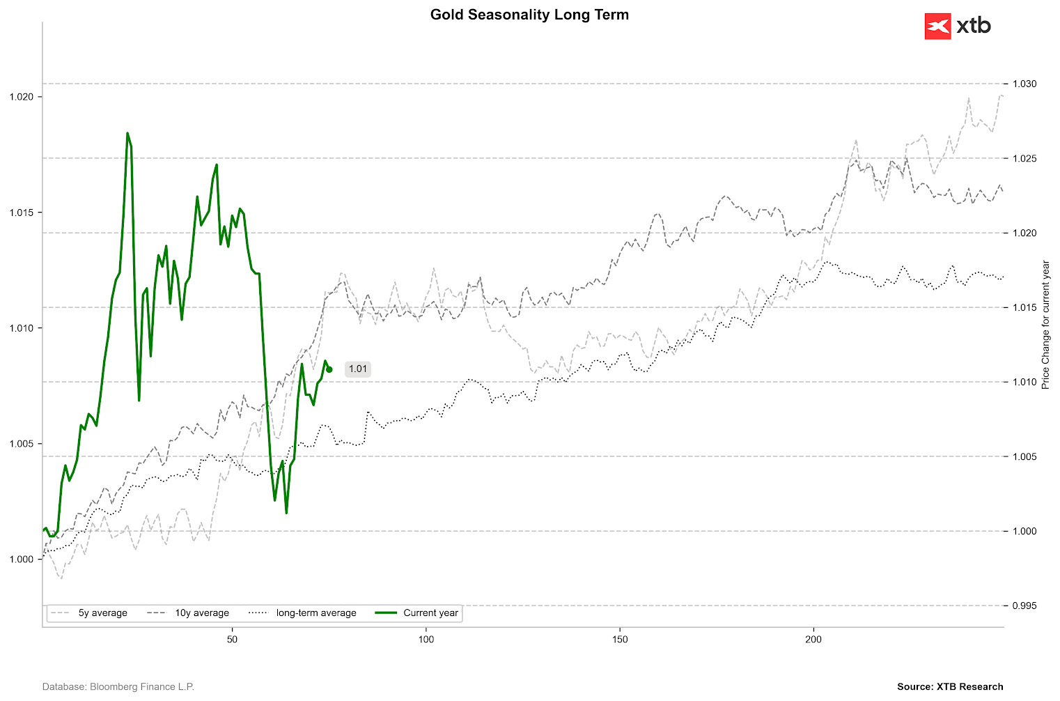 Vzhledem ke strukturálním změnám na trhu se zlatem během posledních osmnácti měsíců už sezónnost nemusí být rozhodujícím faktorem. Současná tržní nejistota však vybízí k opatrnosti. Historická data naznačují, že pohyb do strany obvykle trvá 100 až 120 obchodních seancí ročně. To znamená, že jasněji vymezený trend se nemusí objevit dříve než na konci května nebo v červnu.