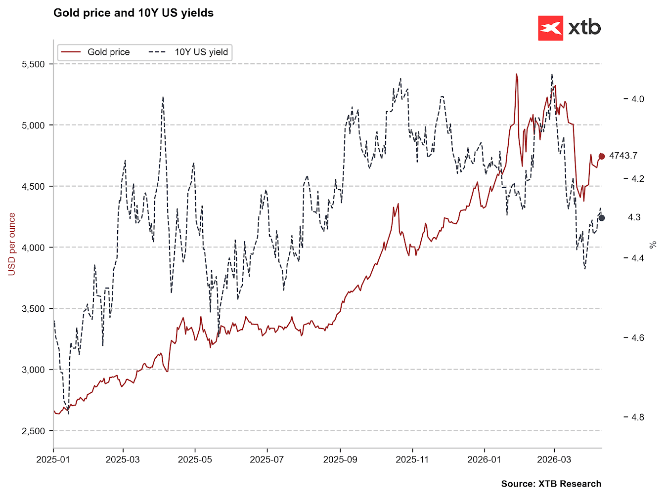 Silnější korelace je patrná také s výnosy 10letých amerických dluhopisů. Pokud by se výnosy vrátily směrem k 4,0 %, existovala by šance, že se zlato znovu bude obchodovat výrazně nad hranicí 5 000 USD. Zároveň je ale třeba poznamenat, že vedle úrokových sazeb hraje ve vývoji výnosů velkou roli také sentiment ohledně udržitelnosti amerického dluhu. Zdroj: Bloomberg Finance LP, XTB
