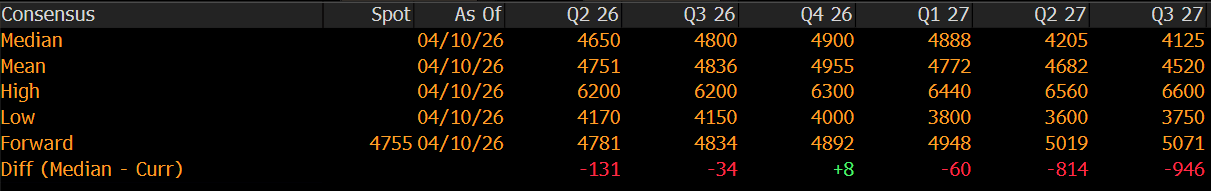 Očekávání ohledně zlata zůstávají opatrně optimistická. Mediánový výhled se nachází na úrovni 4 650 USD za unci — tedy pod nedávnými maximy, ale zároveň žádná významná instituce neočekává pokles pod 4 000 USD. Potenciální cenový vrchol se očekává ke konci letošního roku, přičemž trhy následně počítají s určitým ochlazením. Zajímavé je, že ani nejagresivnější prognózy nepočítají s tím, že by zlato do 3. čtvrtletí 2027 překročilo 6 600 USD.