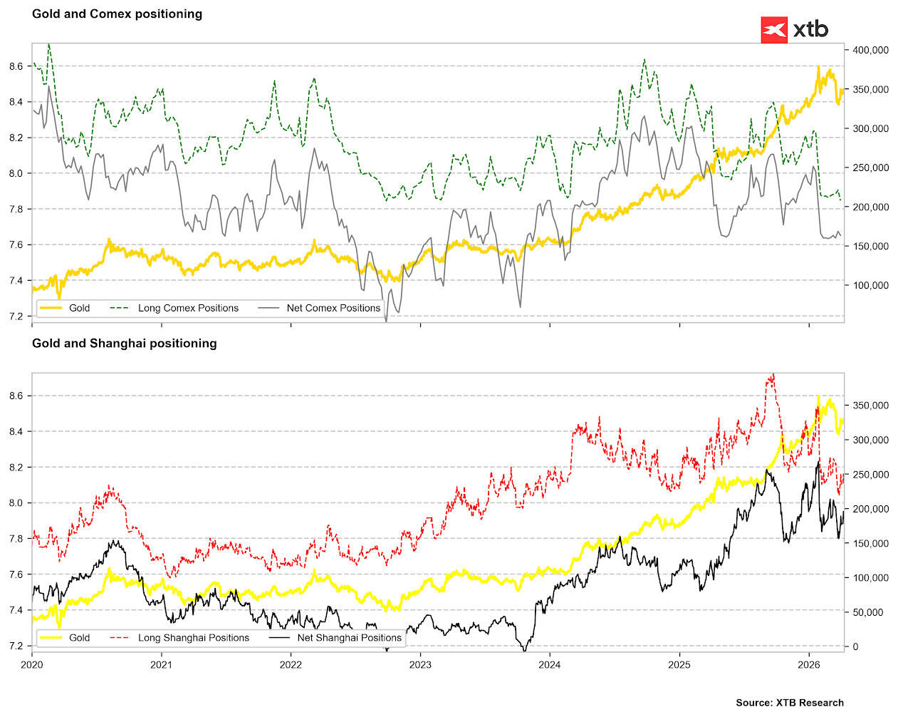 Přestože ETF obnovily nákupy, spekulativní aktivita zůstává utlumená. Long pozice na trhu COMEX klesly na nejnižší úrovně od období 2023/2024, i když čisté pozice zatím nejsou na extrémně nízkých hodnotách. Podobně také na Shanghai Commodity Exchange spadly long pozice na několikaletá minima, zatímco čisté pozice se teprve nyní odrážejí ode dna z konce roku 2025. To zatím nepředstavuje silné býčí signály.