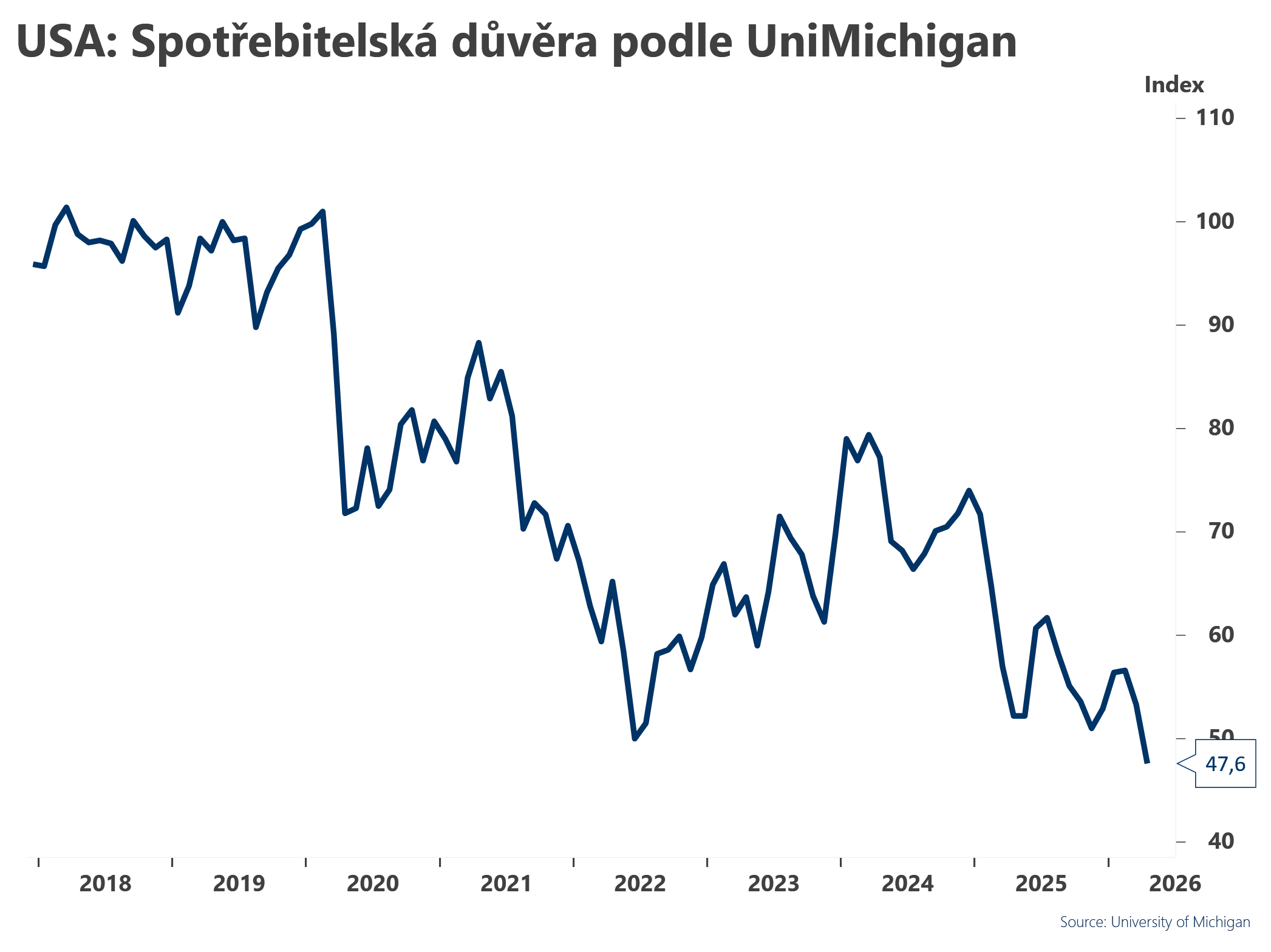 V USA spotřebitelská důvěra University of Michigan
