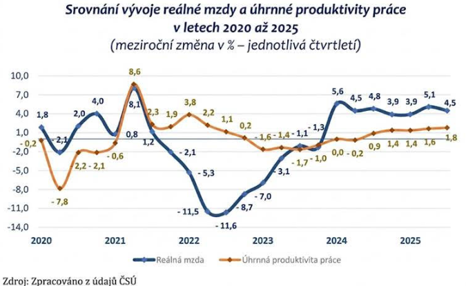 Pohled na srovnání reálných mezd a úhrnné produktivity práce (viz graf MPSV níže) odhaluje nebezpečný trend. Po inflačním šoku reálné mzdy v roce 2024 a 2025 výrazně oživily a rostou tempem kolem 4 až 5 % meziročně. Jenže produktivita práce? Ta roste výrazně pomaleji, většinou jen kolem jednoho až maximálně dvou procent.