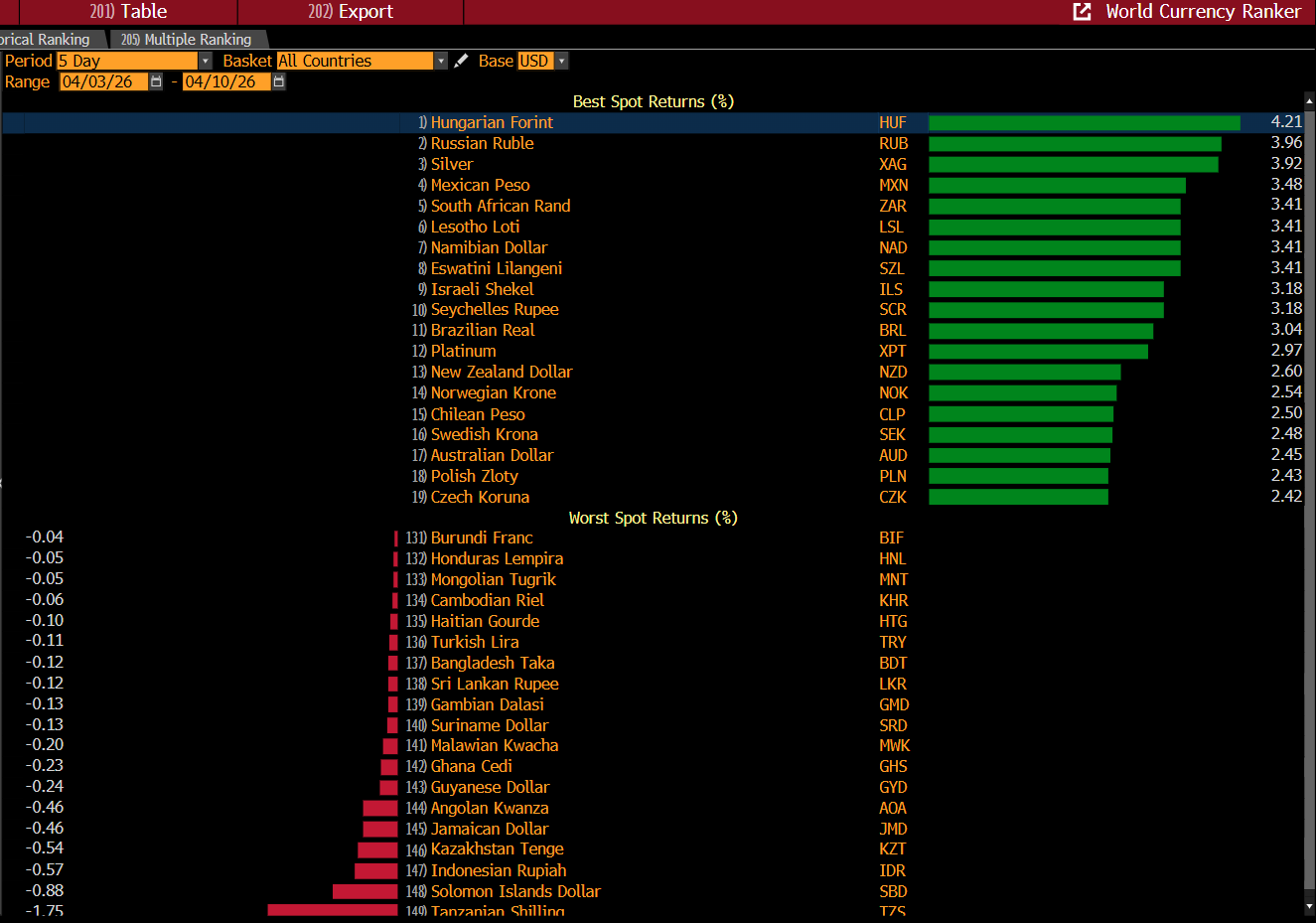 Trhy věří, dny Victora Orbána v čele Maďarska jsou dneškem po šestnácti letech fakticky sečteny. Maďarský forint v posledních pěti obchodních dnech zpevnil vůči americkému dolaru o 4,2 procenta. Žádná jiná měna světa v uplynulém týdnu vůči dolaru tolik nezískala (viz tabulka Bloombergu níže).
