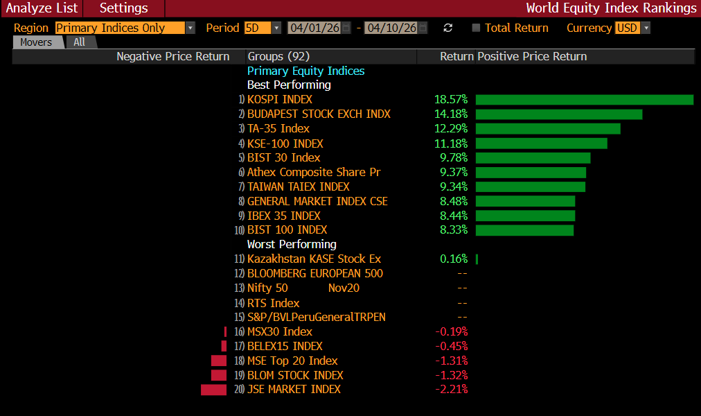 Daří se také maďarským akciím a dluhopisům. Hlavní ukazatel budapešťské burzy, index BUX, zhodnotil v uplynulém týdnu nejvýrazněji ze všech hlavních burzovních indexů světa s výjimkou jihokorejského (viz tabulka Bloombergu níže). V dolarech maďarské akcie zhodnotily v posledních pěti obchodních dnech o 14,2 procenta.
