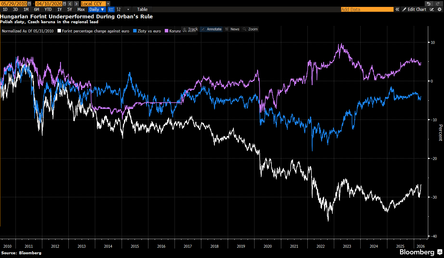 Méně investic těchto firem přispělo k relativně slabému výkonu maďarské ekonomiky i v porovnání s dalšími zeměmi Visegrádské čtyřky. Například forint za Orbánovy éry, trvající od roku 2010, podává výrazně slabší výkon než polský zlotý a zejména než česká koruna (viz graf Bloombergu níže).