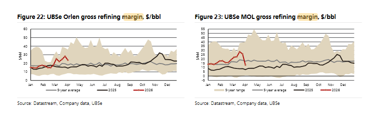 Za propadem stojí z podstatné části opatření vlád středoevropských zemí. Nejprve ke krocení cen u čerpacích stanic přistoupily v důsledku války v Íránu Maďarsko a Slovensko. Když hrozilo, a částečně se to již zjevně dělo (v Česku v březnu nafta zdražila nejvíce ze zemí EU, o více než 40 procent, vyplývá z dat Evropské komise), že si petrochemická jednička těchto zemí, maďarský MOL, bude kompenzovat své ušlé maďarské a slovenské zisky v Česku, rozhodlo Česko na začátku dubna omezení marží i právě v ČR, k němuž došlo tento týden. Rafinační marže MOL tak klesá z březnového maxima takřka 30 dolarů na barel na méně než polovinu, letos vůbec poprvé výrazněji pod pětiletý průměr.