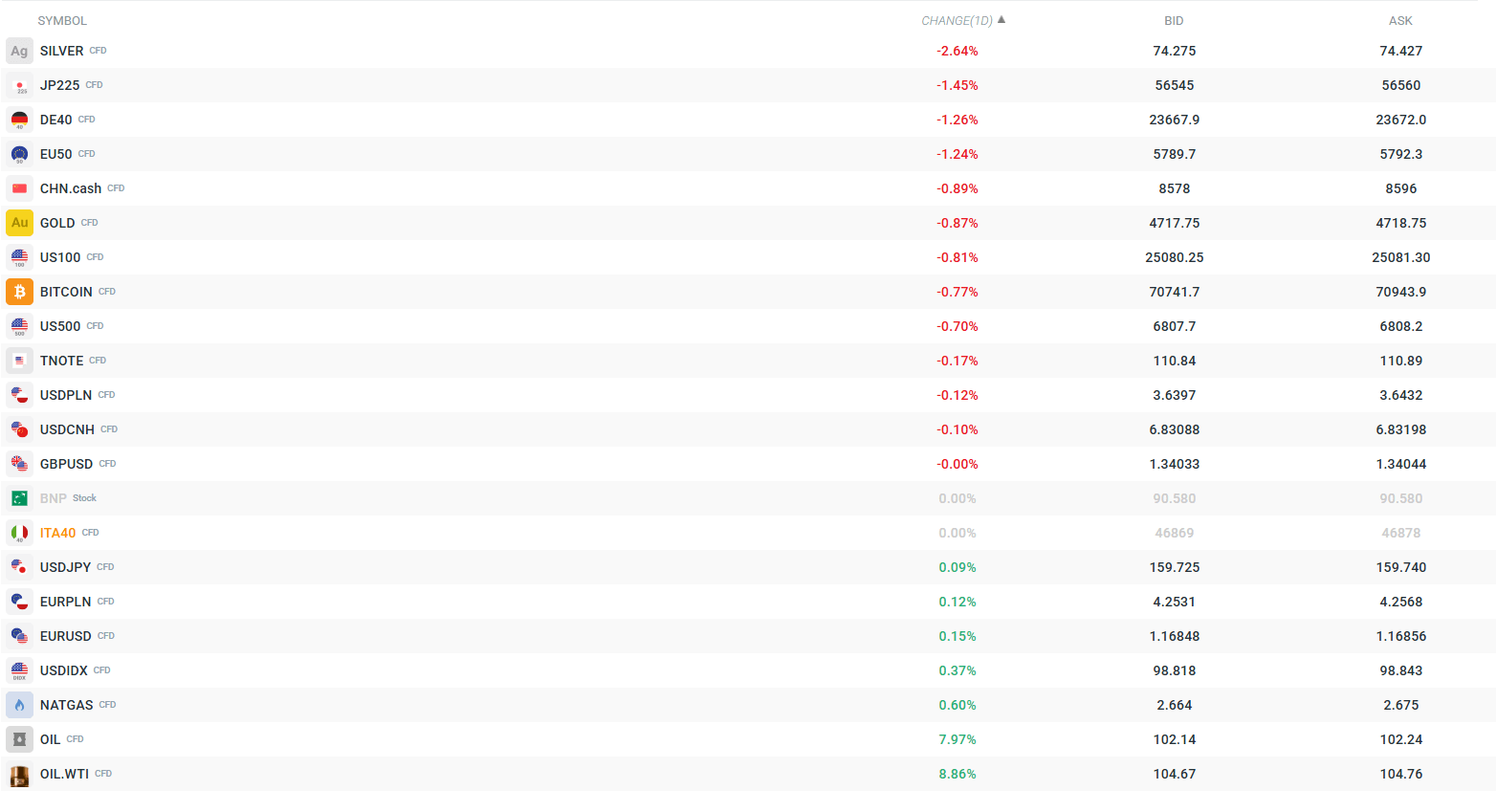 - DE40 klesá o 1,16 %, EU50 o 1,15 %, JP225 o 1,37 % a CHN.cash o 0,84 % — globální obrázek zůstává jasně negativní.