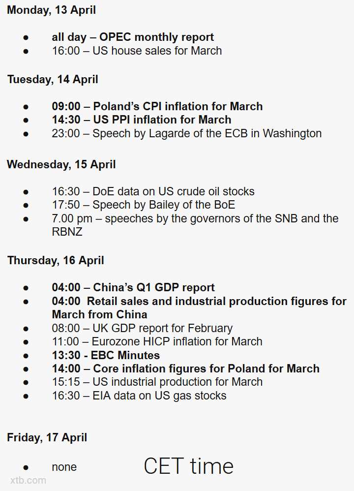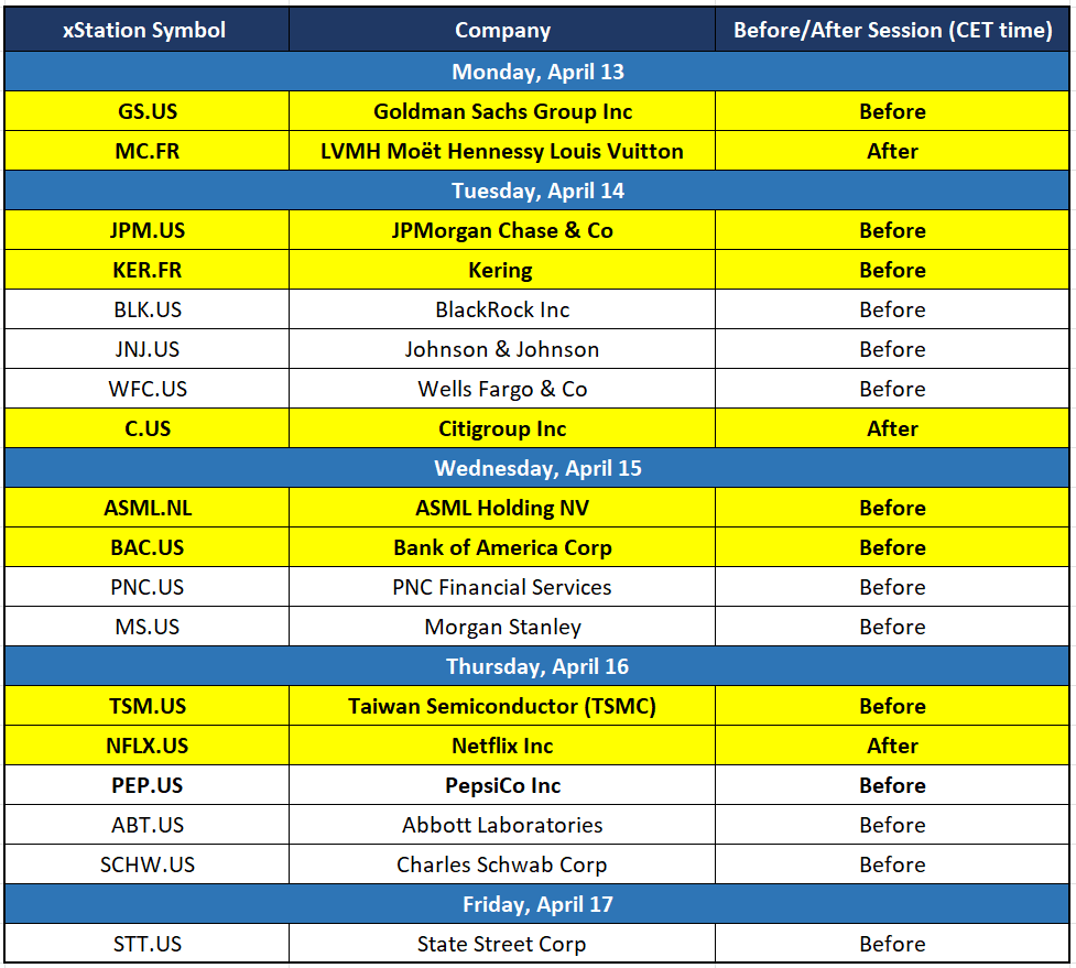 V průběhu týdne budou klíčové tři věci: vývoj kolem Íránu, začátek výsledkové sezóny za 1. čtvrtletí a makroekonomická data z USA a Evropy, která mohou buď potvrdit, nebo zpochybnit dopad vyšších cen ropy na inflaci. Mezi očekávanými daty jsou polská CPI, americká PPI, údaje o prodejích domů, zápis z jednání ECB, inflace HICP v eurozóně a data z Číny, takže trh bude současně vyhodnocovat geopolitiku, inflaci i výhled růstu. Zvláštní pozornost se zaměří na banky, LVMH, ASML, TSMC a Netflix, protože jejich výsledky nabídnou první signál, jak si firmy vedou na začátku výsledkové sezóny.