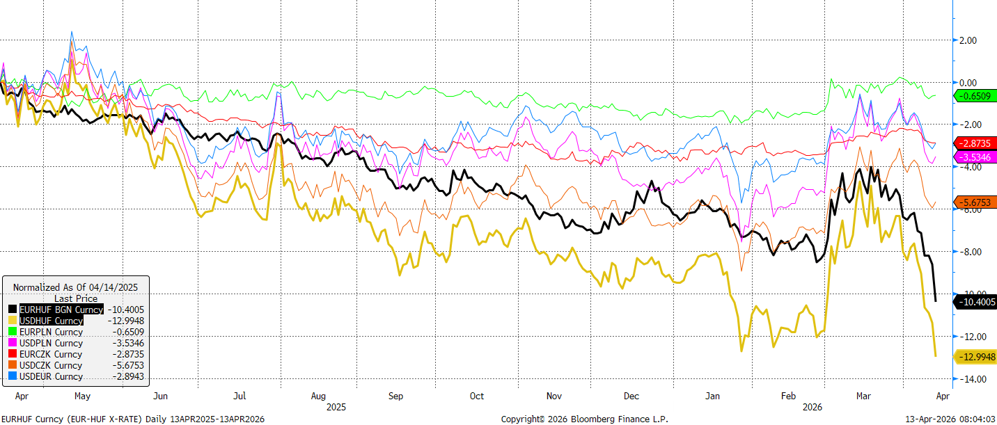 Po 16 letech vlády Viktora Orbána se Maďarsko probouzí do nové reality. Strana Tisza pod vedením Pétera Magyara dosáhla historického vítězství, které nejen ukončuje éru „neliberální demokracie“, ale díky pravděpodobné ústavní většině (2/3 mandátů) dává novému lídrovi mandát k zásadní přestavbě státu. Forint je během pondělního otevření trhu jednou z nejsilnějších měn na globálním trhu, navzdory prudkému napětí na Blízkém východě. Mezitím se Brusel dívá na Budapešť s nadějí, což může naznačovat další prostor pro posílení lokálních aktiv.