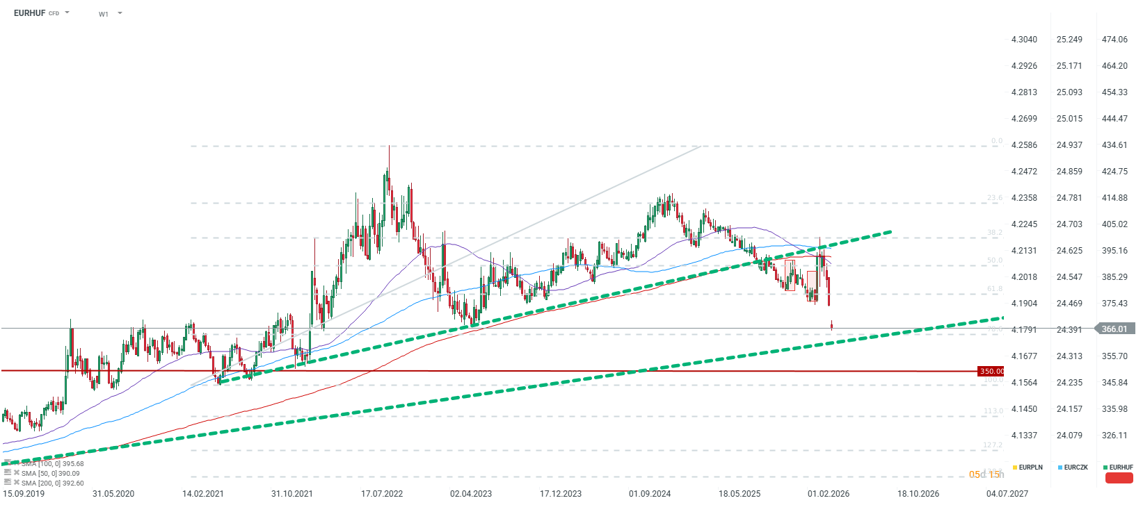 EUR/HUF klesá k úrovni 366, tedy na nejnižší hodnotu od dubna 2022. Případné další posílení forintu o 5 % by otevřelo prostor k testu úrovně 350, která nebyla vidět od září 2021. Pohyb pod 360 by zároveň znamenal prolomení 15leté rostoucí trendové linie. Zdroj: xStation5