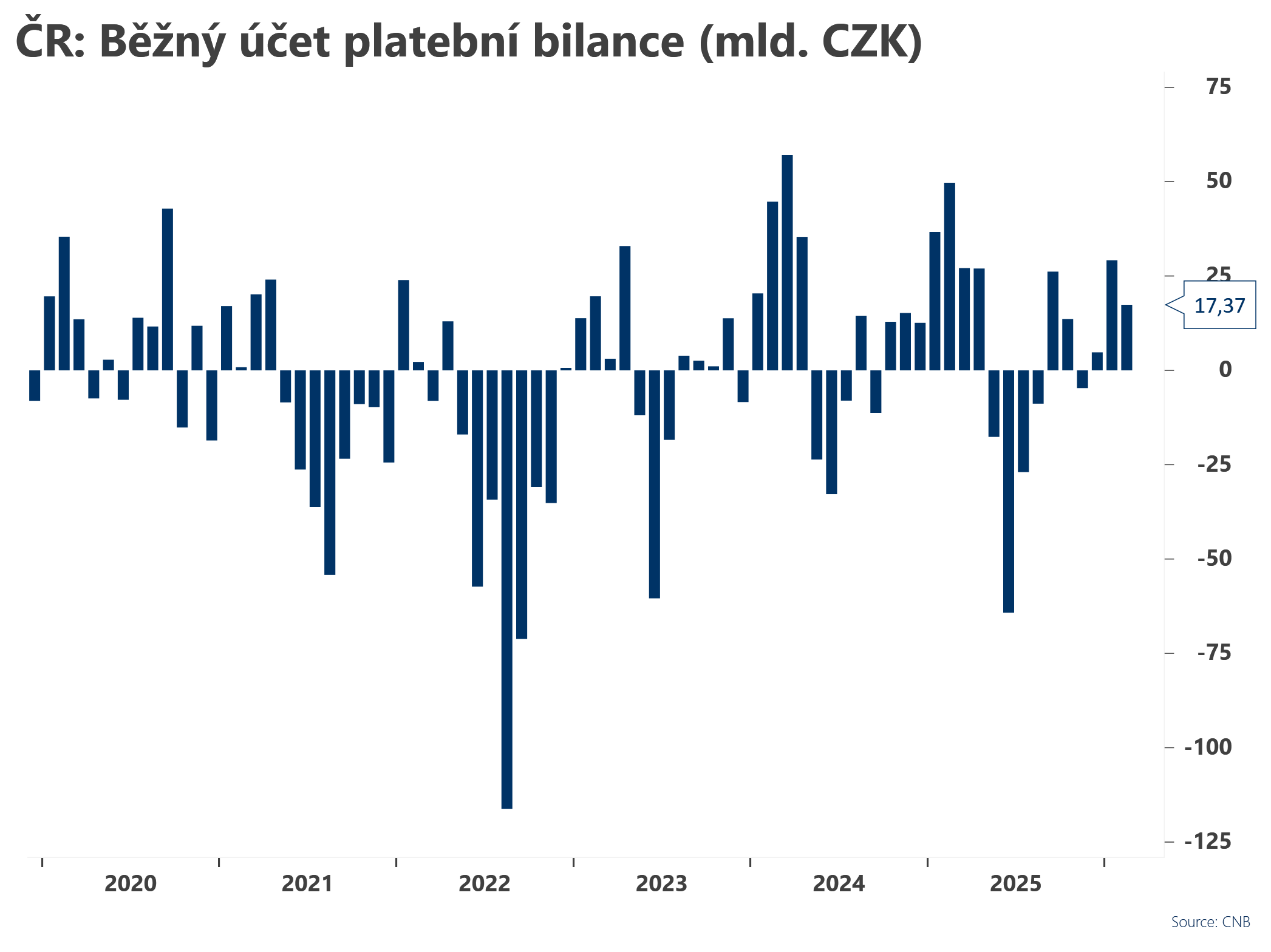 Běžný účet platební bilance dosáhl v říjnu deficitu 3,7 mld. CZK, tedy výrazně méně, než trh očekával (16,8 mld. CZK). Za lepším výsledkem stál především zahraniční obchod, který v metodice platební bilance dosáhl deficitu pouze 0,1 mld. CZK. Výrazný nebyl ani odliv dividend, který v říjnu činil 4 mld. CZK. V prvotních a druhotných důchodech se pak pozitivně odrazilo aktivní saldo převodů z rozpočtu EU do ČR (6,3 mld. CZK). Na kapitálovém účtu pak příjmy z rozpočtu EU dosáhly 3,5 mld. CZK. -