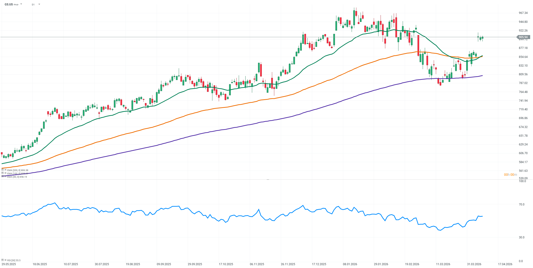 1. čtvrtletí 2026 bylo pro Goldman Sachs jednoznačně pozitivní. Výsledky táhlo velmi silné obchodování s akciemi a výrazné oživení investičního bankovnictví, zejména v oblasti poradenství. Slabší výkon segmentu FICC a vyšší náklady nemění celkově pozitivní obraz společnosti, která zůstává jedním z hlavních příjemců zlepšující se aktivity na kapitálových trzích.