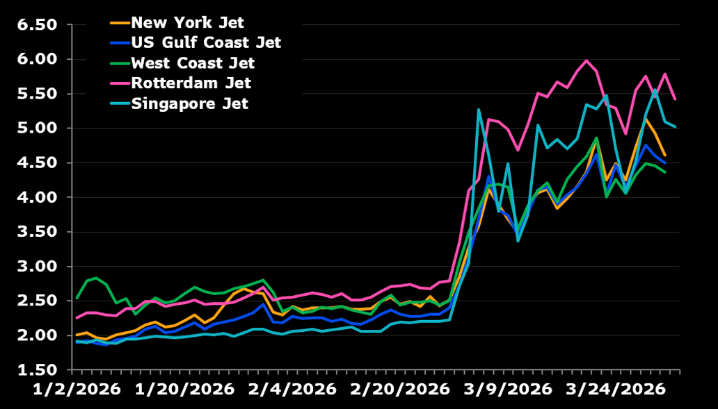 Vzhledem k tomu, že Blízký východ představoval neúměrně velký podíl na globálních dodávkách leteckého paliva, blokáda průlivu a útoky na infrastrukturu zvýšily ceny leteckého paliva o 100 % až 200 % podle regionu. Přirozeným důsledkem by tak byl silný tlak na náklady aerolinek, tedy růst nákladů přibližně o 30 až 60 %.