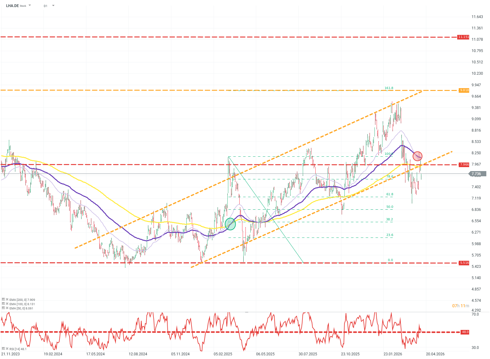 Cena akcie dál udržuje mírný rostoucí trend. Momentum EMA100 a EMA200 zůstává býčí, ale překřížení EMA50 a EMA100 ukazuje na jasný krátkodobý tlak. Obrana trendové linie bude klíčová pro udržení rostoucího trendu a případné umazání ztrát. Pokud prodejci převezmou kontrolu, cílová úroveň pro další korekci se nachází kolem 7,1 EUR. Zdroj: xStation5