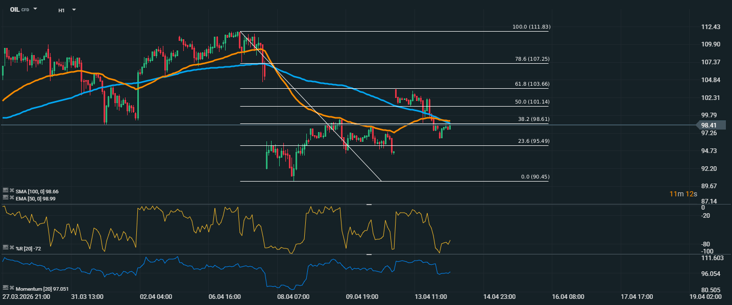 Cena ropy se aktuálně pohybuje kolem 98,41 USD a nachází se v těsné blízkosti důležité Fibonacciho úrovně 38,2 % na ceně 98,61 USD. Trh se po předchozím poklesu od oblasti 103,66 USD snaží stabilizovat, ale zatím nevysílá jednoznačně silný signál obratu. Aktuální cena se drží mírně pod klouzavými průměry EMA 50 (98,99 USD) i SMA 100 (98,66 USD), což naznačuje, že krátkodobě mají stále navrch spíše prodejci. Williams %R se pohybuje kolem -72, což ukazuje na slabší tržní dynamiku a stále zvýšený tlak na spodní hraně krátkodobého pásma. Současně Momentum na hodnotě 97,05 zůstává pod neutrální úrovní 100, takže ani tento ukazatel zatím nepotvrzuje návrat výraznější síly kupců. To podporuje opatrný výhled, podle kterého trh potřebuje nejprve přesvědčivě překonat rezistenční oblast v okolí 98,6 až 99,0 USD.