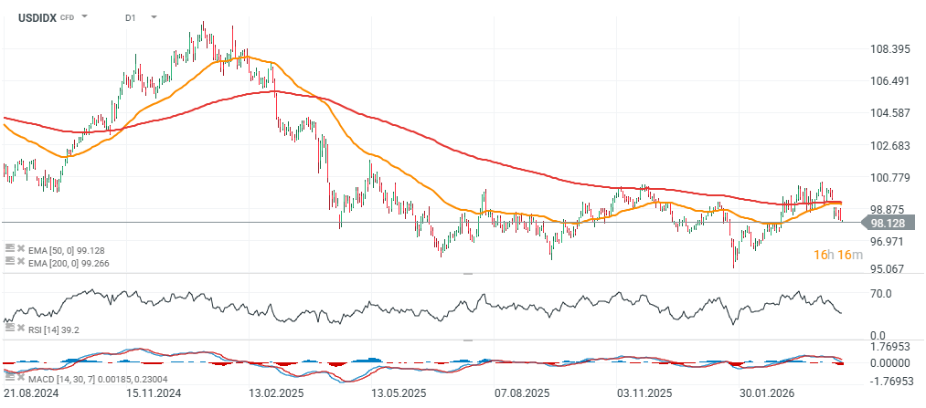 Měnový pár EUR/USD oslabuje o 0,32 % intradenně a obchoduje se v oblasti 1,1852. Zároveň USD/JPY setrvává pod úrovní 154,500, což je klíčová kontrolní zóna vymezená 100denním klouzavým průměrem EMA.