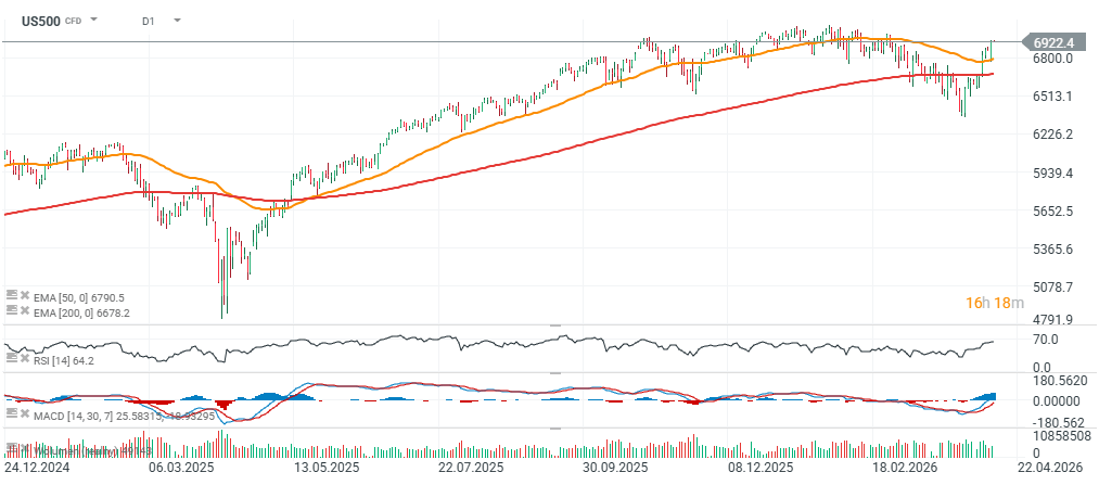 - Indexové futures v USA dnes obchodují mírně níže, ale nadále si udržují silný uptrend. Index US500 se pohybuje poblíž 6 920 bodů, tedy přibližně 100 bodů pod svým historickým maximem.