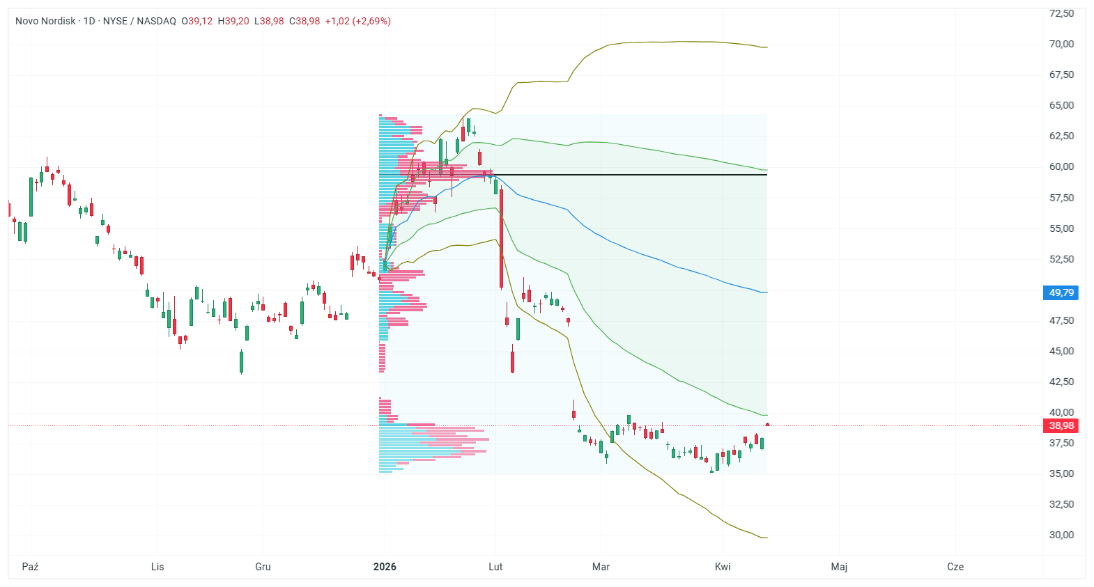 Akcie Novo Nordisk po zveřejnění slabšího výhledu na rok 2026 klesly přibližně o 15 až 20 %, což stlačilo ocenění i přesto, že poptávka po lécích Ozempic a Wegovy a po nových perorálních GLP1 terapiích zůstává silná. Zároveň jde o společnost s dividendovým výnosem okolo 3,8 % a konzervativním výplatním poměrem přibližně 50 %, přičemž konsenzuální cílové ceny stále naznačují dvouciferný procentní potenciál růstu oproti současné ceně akcie. -
