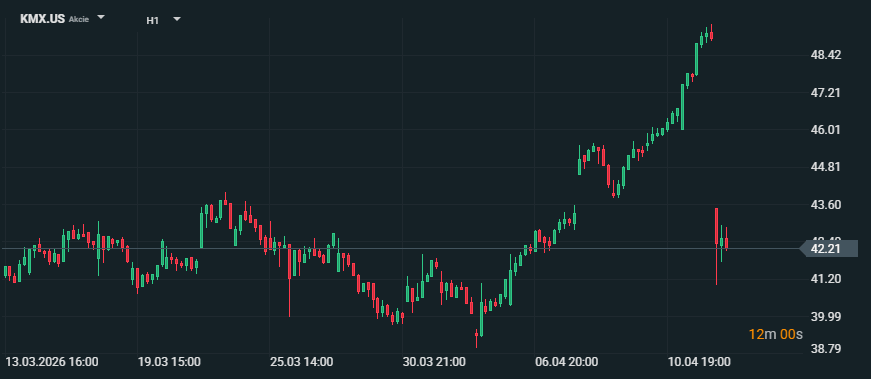 Akcie CarMax 14. dubna oslabily přibližně o 13 % poté, co prodejce ojetých vozů oznámil čistou ztrátu za čtvrté čtvrtletí a slabší marže na vozidlech. Společnost uvedla, že výsledky zasáhl nehotovostní goodwill odpis ve výši 141,3 milionu USD, restrukturalizační náklady a slabší ziskovost v retailovém i velkoobchodním segmentu ojetých vozů. Tržby meziročně klesly o 1 % na 5,95 miliardy USD. Zdroj: xStation5