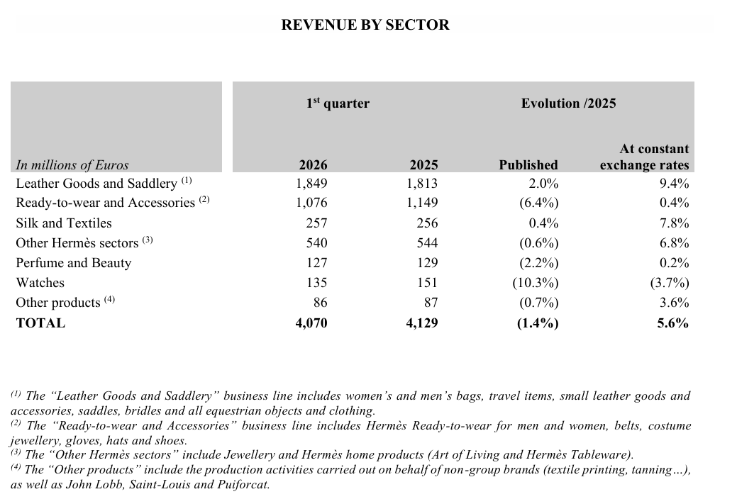 - 🕌 Blízký východ (ostatní): -5,9 % — od března má válka drastický dopad; prodeje v luxusních obchodních centrech v SAE, Kuvajtu, Kataru a Bahrajnu prudce klesly; obrat v dubajských obchodních centrech se v březnu propadl o 40 %; tento region byl přitom po celý rok 2025 nejrychleji rostoucím trhem společnosti Hermès