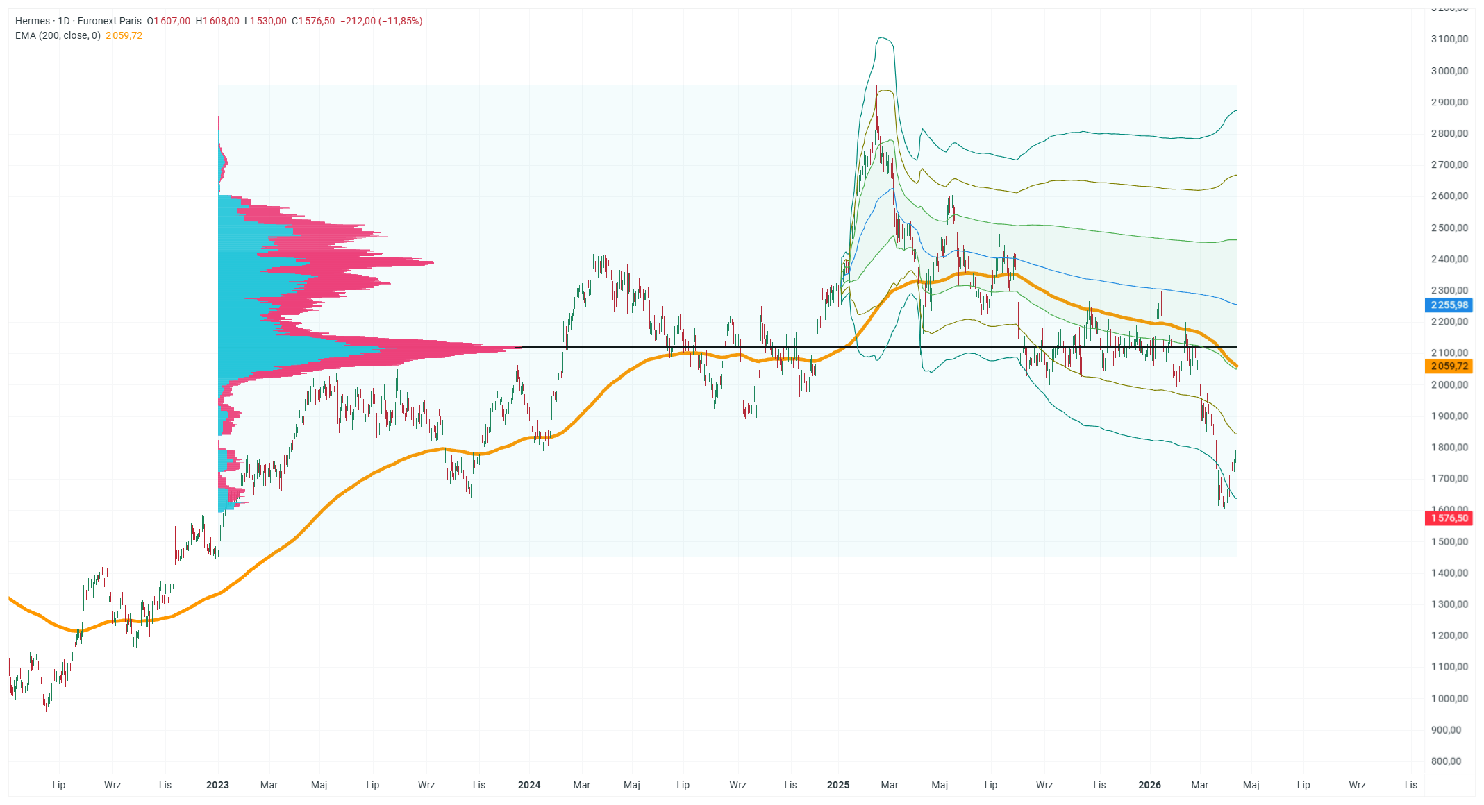 Graf akcií Hermès na burze Euronext Paris ukazuje silný uptrend od roku 2023, který v roce 2024 ještě zrychlil a na začátku roku 2025 vyvrcholil nad úrovní 3 100 EUR. Následně ale v posledních týdnech přišel prudký pokles ceny o více než 11,85 %. EMA200 (oranžová linie) po většinu období od roku 2023 fungovala jako dynamický support, ale od začátku roku 2025 se cena dostala pod tuto úroveň a nyní se nachází výrazně pod tímto průměrem. Aktuální hodnota EMA200 činí 2 059,72 EUR. Volume profile (vlevo) ukazuje velmi výraznou zónu vysoké aktivity mezi přibližně 1 800 až 2 300 EUR, přičemž nejvyšší koncentrace tickového objemu se nachází kolem 2 000 až 2 100 EUR. Tato oblast nyní po poklesu funguje jako silná zóna resistence/supportu. Od vrcholu v roce 2025 se cena pohybuje kolem úrovně VWAP (černá horizontální linie), která po většinu času sloužila jako tržní rovnováha. Aktuálně se však cena nachází pod touto linií, což potvrzuje převahu prodejců v posledním období.