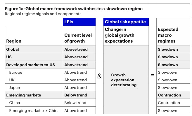 V tomto prostředí vede kombinace pevných ekonomických fundamentů a ochlazujících se tržních očekávání růstu k tomu, že identifikujeme přechod do režimu zpomalování. Ten je definován spíše slábnoucí ochotou podstupovat riziko kvůli situaci na trhu než skutečným zhoršením základní ekonomické aktivity (grafy 1a, 1b a 1c).