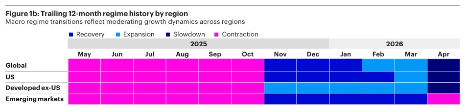 Přechody z režimu expanze do zpomalování byly historicky spojeny s mírnými, avšak obecně stále pozitivními výnosy napříč třídami aktiv, zároveň však s postupným přibližováním výkonnosti růstově citlivých a defenzivních aktiv.