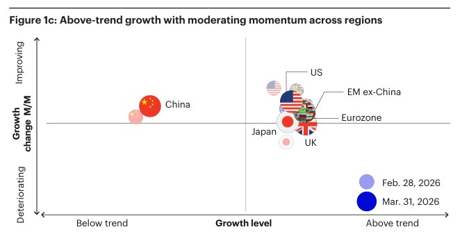 Celkově tyto faktory naznačují, že globální expanze přechází do pomalejšího růstu, nikoliv tedy že by náhle končila. Přestože pozitivní scénáře — například rychlá deeskalace konfliktu a normalizace dodávek energií — by mohly znovu obnovit silnější dynamiku, eskalace geopolitických rizik přinesla výrazně nejistější prostředí. Vyšší ceny energií, přísnější finanční podmínky a zvýšená nejistota začínají doléhat na očekávání růstu, i když základní ekonomická aktivita zůstává celkově odolná.