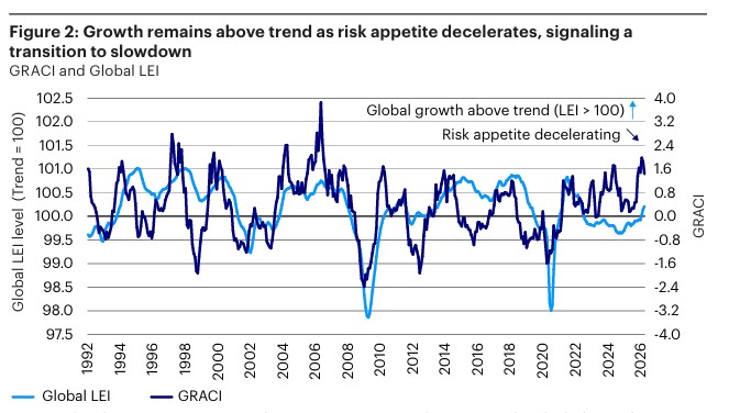 Na tomto pozadí nejnovější hodnoty předstihových ekonomických ukazatelů (LEI) společnosti Invesco nadále ukazují globální ekonomiku, která zůstává celkově odolná, přičemž stabilita LEI napříč regiony přetrvává. Úrovně růstu v USA i na rozvinutých trzích mimo USA zůstávají nad trendem, podpořené odolnou domácí poptávkou a příznivou cyklickou dynamikou.
