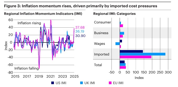 Rostoucí ceny energií se zároveň promítají do vyšší dynamiky inflace napříč regiony. Ukazatele inflačního momenta zrychlily již třetí měsíc v řadě, především v důsledku růstu cen energií (graf 3). Tento vývoj komplikuje výhled měnové politiky, zejména pro centrální banky v ekonomikách závislých na dovozu energií, kde mohou silnější krátkodobé inflační tlaky současně koexistovat se zhoršujícími se střednědobými vyhlídkami růstu.