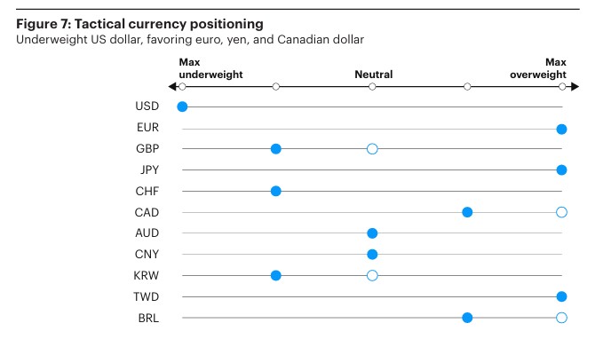 Na měnových trzích držíme podváženou expozici vůči americkému dolaru, což odráží vyšší a dále rostoucí krátkodobé sazby mimo USA spolu s pokračujícími pozitivními ekonomickými překvapeními v několika neamerických ekonomikách.