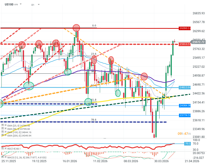 Cena se nadále drží poblíž silné rezistence v oblasti kolem 26 000 bodů. Trh nyní může potřebovat konsolidaci, než bude možný průraz nad nedávná maxima — tento pohled podporuje i zřetelně zvýšené RSI. Pokud si chtějí kupci udržet iniciativu, bude nutné uhájit alespoň oblast kolem 25 800 bodů. Odmítnutí na rezistenci by mohlo otevřít prostor pro hlubší korekci a návrat k úrovni 23,6 Fibonacciho retracementu, případně až k úrovni 38,2 Fibonacciho retracementu. Zdroj: xStation5