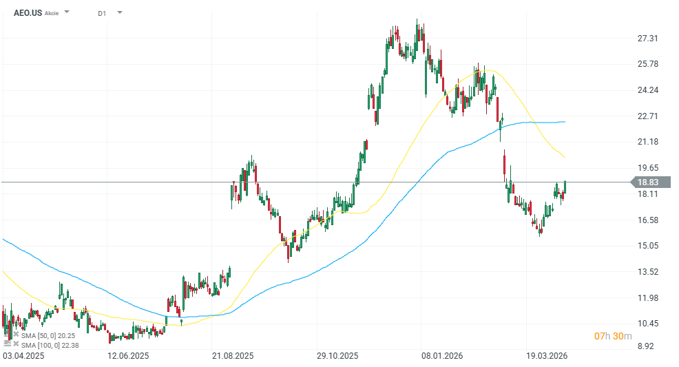 American Eagle v úvodu obchodování rostl o 6 % po zprávách, že společnost spustila novou reklamu pro svou letní kolekci džínových kraťasů. První kampaň s názvem Great Jeans sice čelila kritice na sociálních sítích kvůli vnímaným rasovým podtextům, ale od svého spuštění v červenci 2025 pomohla akciím vyrůst o 77 %. Tržby za šest měsíců navíc vzrostly o 37 %, zatímco v meziročním srovnání s předchozím obdobím rostly o 24 %. Přesto jsou akcie American Eagle letos stále přibližně o 28 % níže.