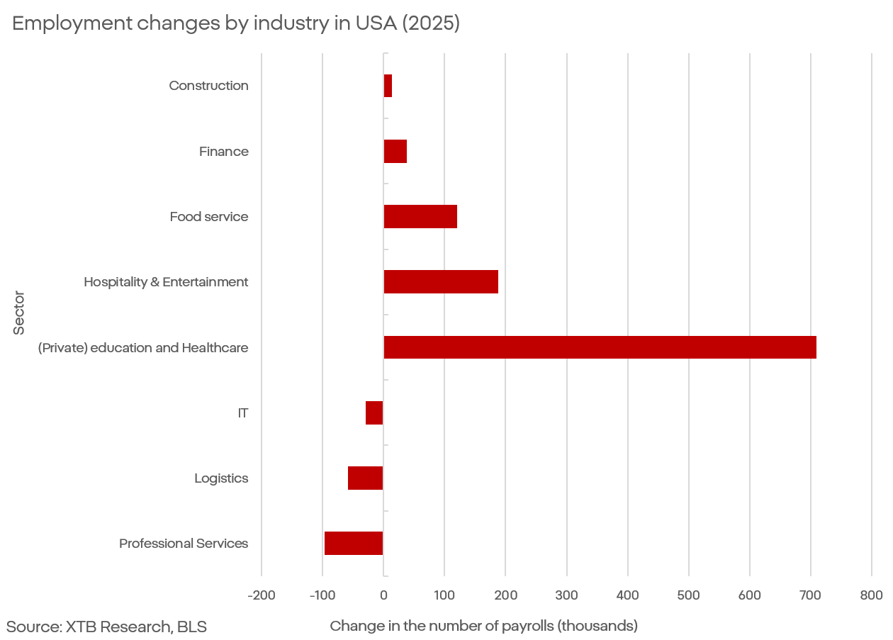 Zvláštní pozornost si zaslouží skutečnost, že růst zaměstnanosti je velmi silně koncentrován do zdravotnictví a školství. Otázka, kterou bychom si ale v souvislosti s trhem práce měli klást mnohem hlasitěji, nezní, zda se skutečně zhoršuje, ale do jaké míry jsou současné trendy opravdu taženy AI.